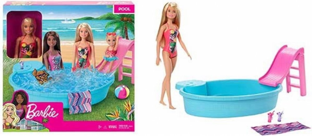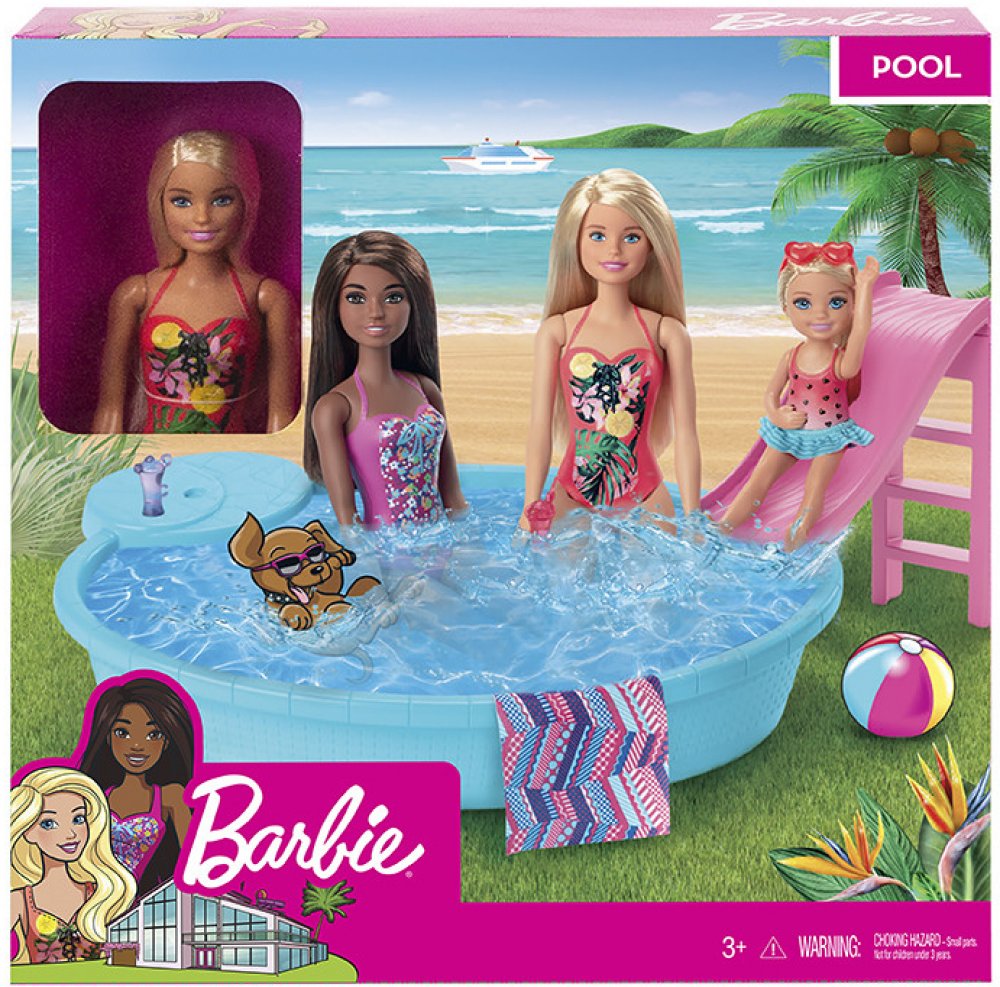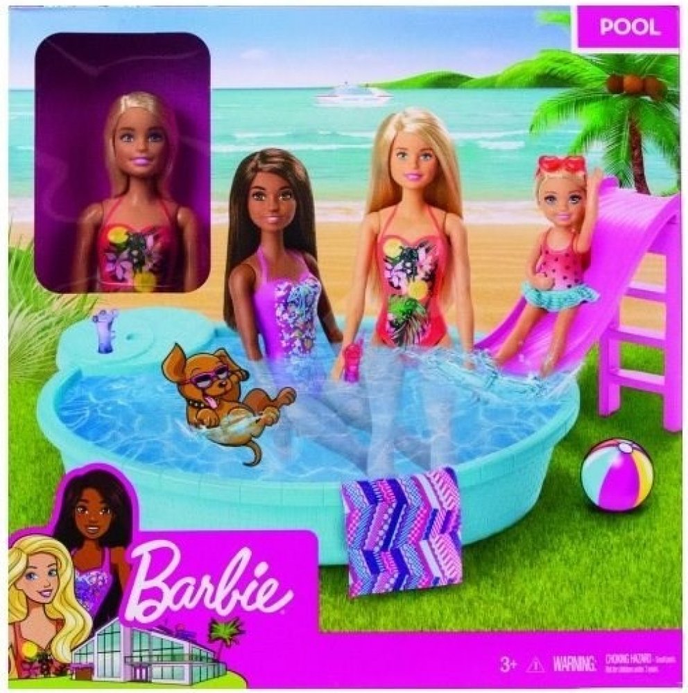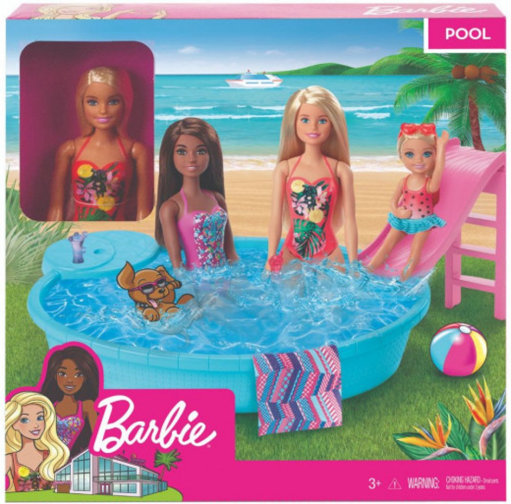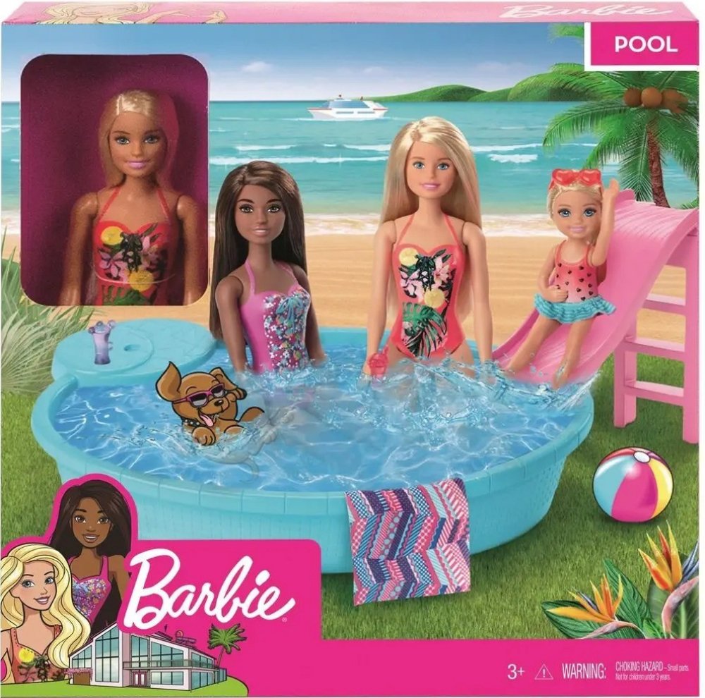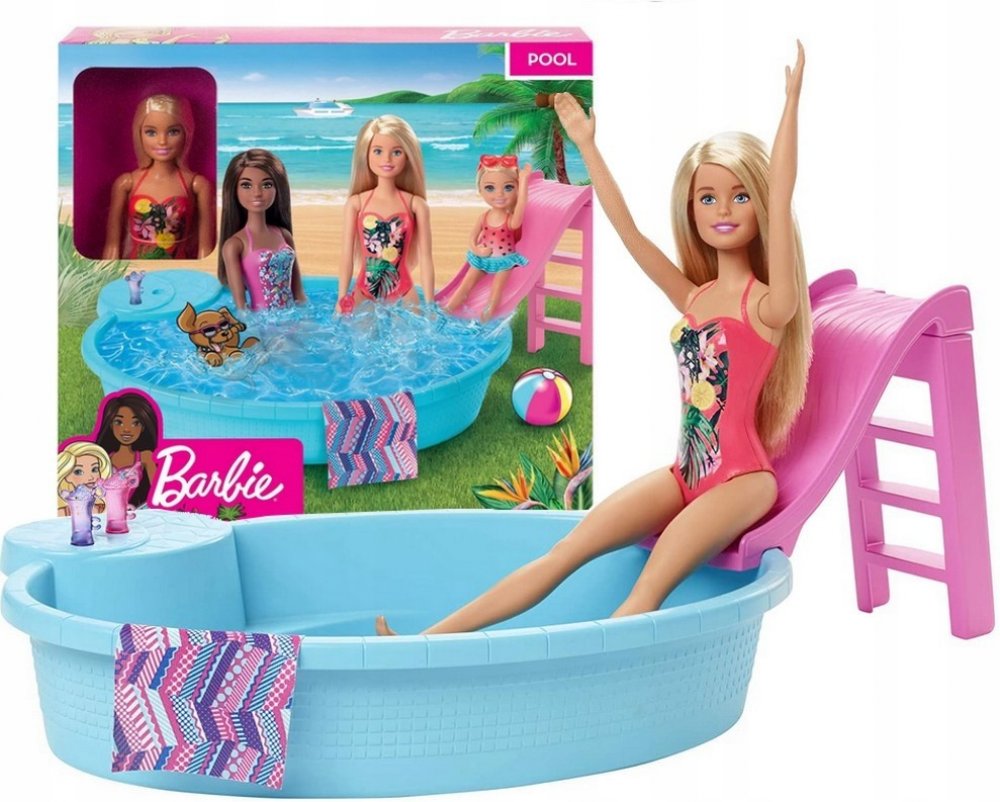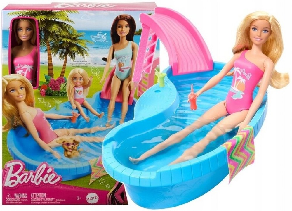 Připoj se k panence Barbie a užijte si společně horké letní dny u jejího bazénu. Tento parádní modrý bazén je tak akorát velký pro panenku Barbie i všechny její sestřičky. Napusť do něj vodu namíchej osvěžující nápoje do připravených sklenic a umísti je na vestavěný stolek kde je budou mít panenky neustále nadosah. Jakmile si budete chtít s panenkami užít trochu zábavy stačí vyšplhat po schůdkách na stylovou klouzačku a zábava začíná. A když je na čase jít z vody ven použij připravenou osušku která může posloužit i jako deka. Panenka Barbie se oblékla do zářivých plavek s pestrobarevnými vzory a již se nemůže dočkat až společně uspořádáte bazénovou párty. Věk 3