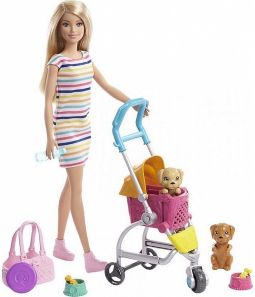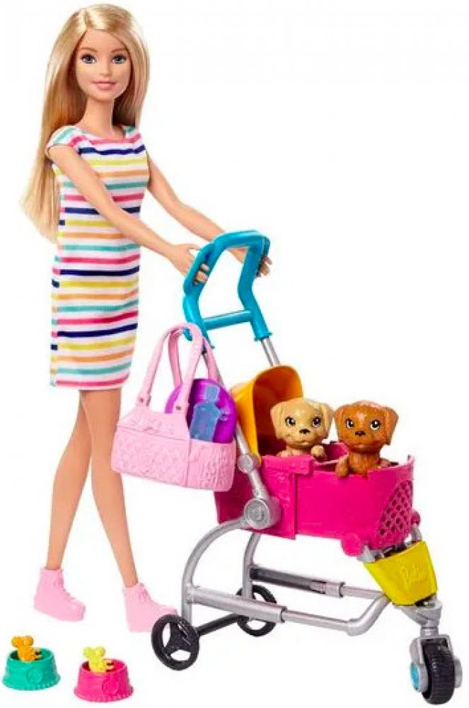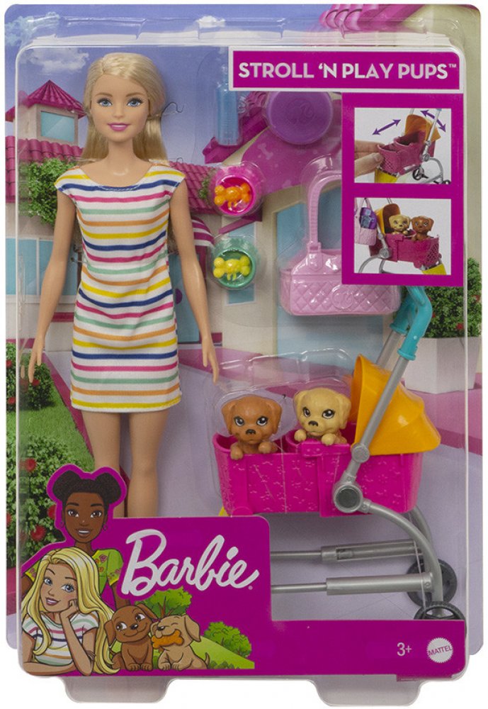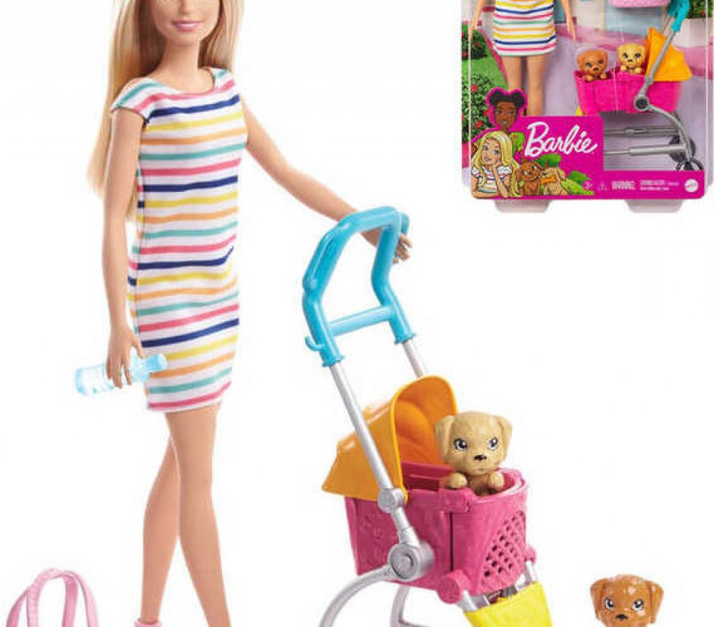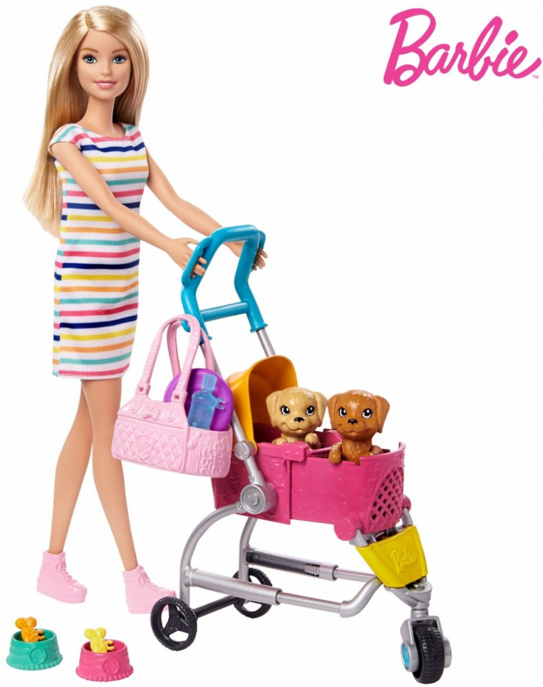Milovníci zvířat si mohou pomocí Puppy kočárku (s transformovatelným kočárkem, 2 roztomilými štěňátky a 7 doplňky) vzít štěňátka na otočku se svou panenkou Barbie! Připravte se na den hraní se štěňaty. Panenka může své žáky přepravovat dvěma způsoby. Vložte jedno štěně do kočárku a druhé do tašky Barbie, nebo posuňte přední část kočárku od sebe, abyste uvolnili místo pro oba psy! Kočárek má moderní barevný styl, oranžový vrchol lze vyklopit a dát tak štěňátkům za slunečného dne stín, věšák na tašku je mimořádně praktický a stříbrné akcenty mu dodávají jedinečný charakter. Pomozte Barbie chytit rukojeti a zatlačit na vozík, abyste mohli vyrazit. Díky dodávanému příslušenství můžete nakrmit své mazlíčky a hrát si s nimi. Dvě barevné misky a dvě kostky vám umožní znovu vytvořit klasické scény a frisbee bude skvělé pro rekreaci v parku. Kabelky Barbie můžete použít k uložení doplňků nebo přepravě štěněte! Panenka má rozkošný volný vzhled: pruhované šaty a růžové trenéry. Mladí snílci mohou vyprávět nekonečné příběhy se sadou Barbie.