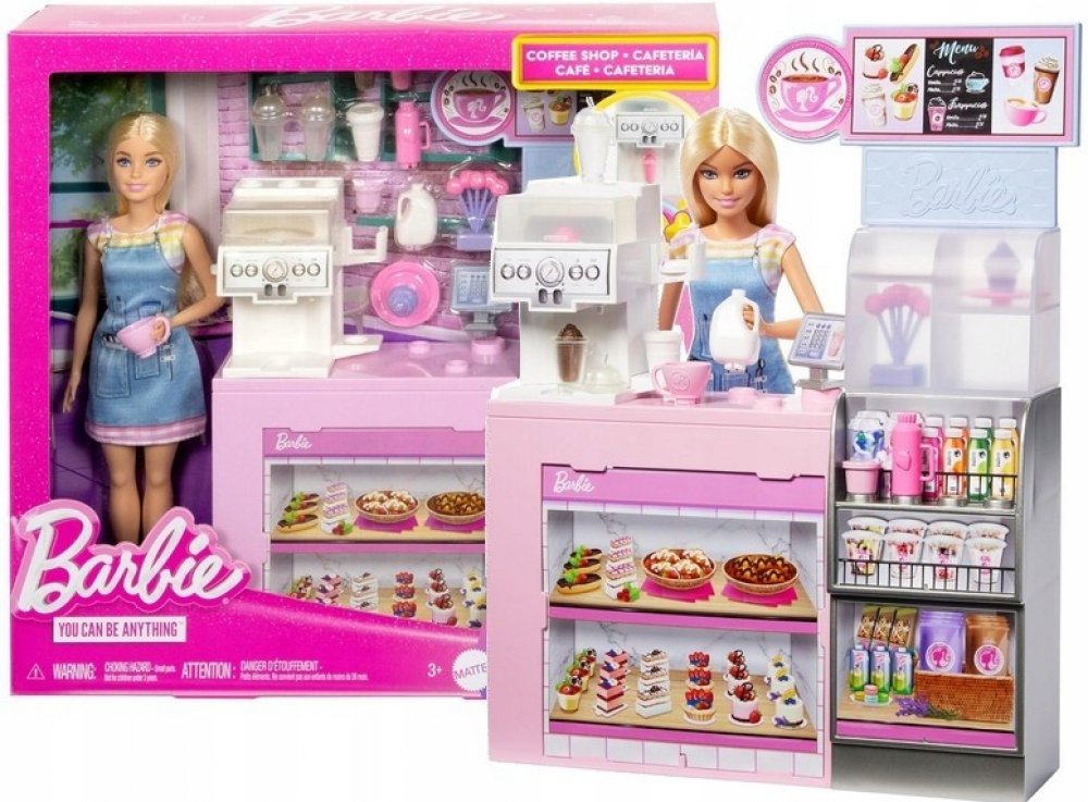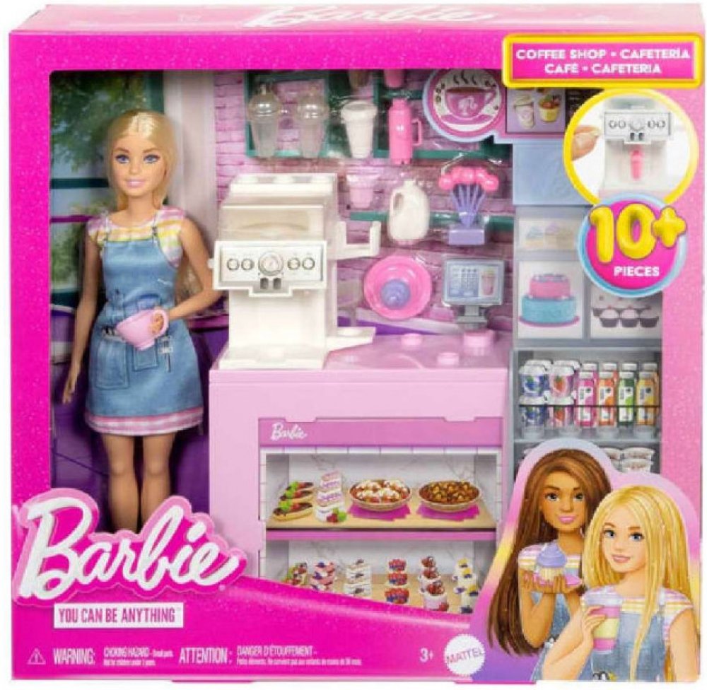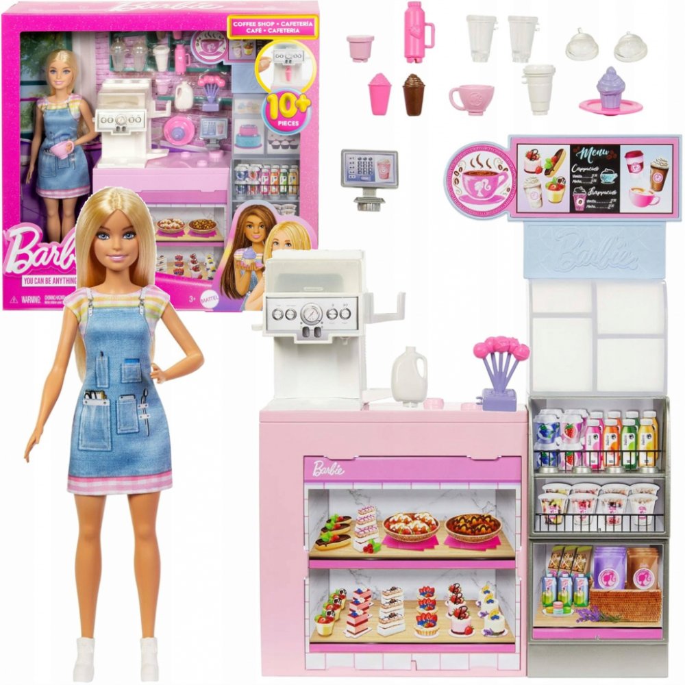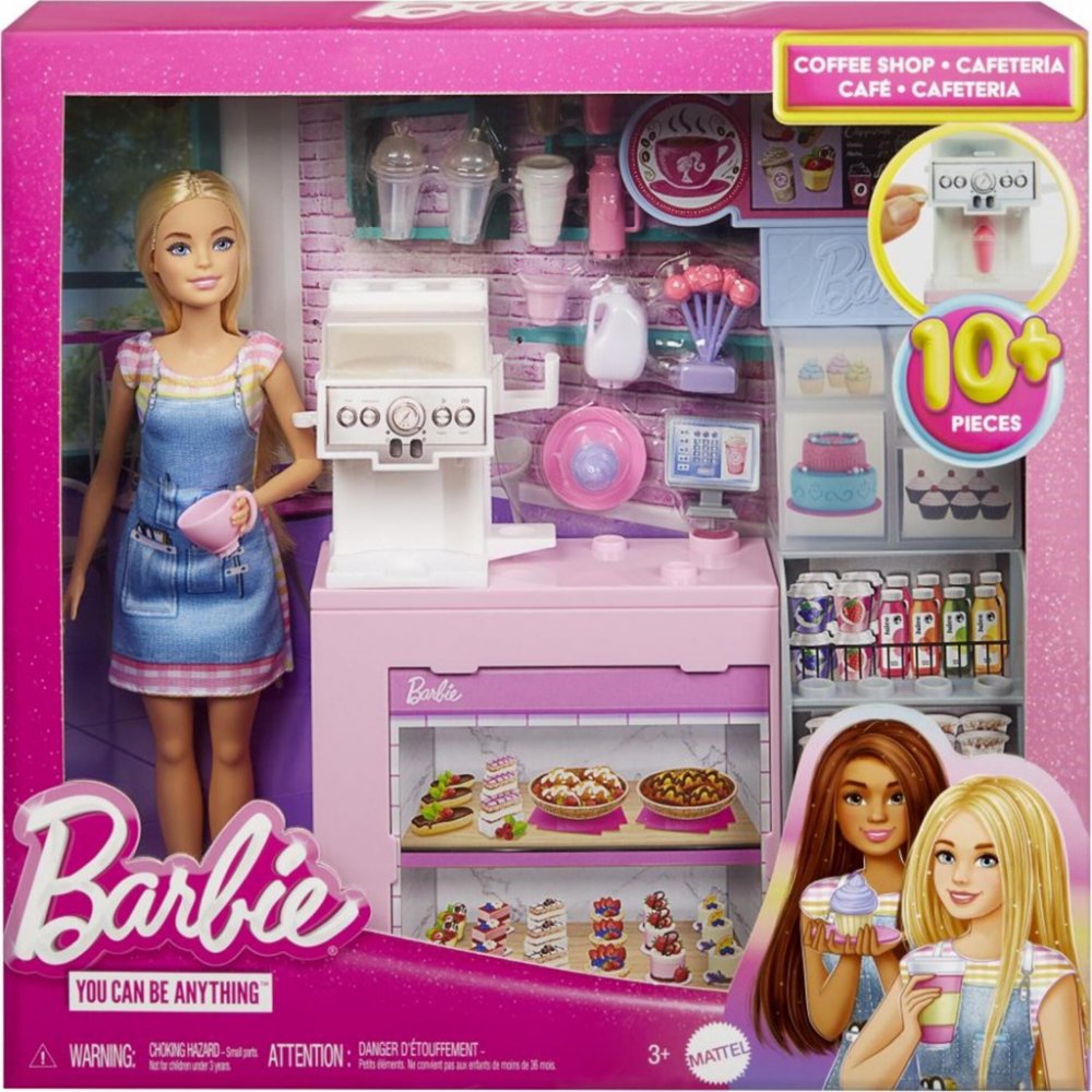 S panenkou Barbie a jejím herním setem Kavárna s panenkou můžete servírovat tu nejlepší kávu – a snít ty nejkrásnější sny – na světě! Kavárenský pult obsahuje kávovar na kávu / smoothie s různými příchutěmi