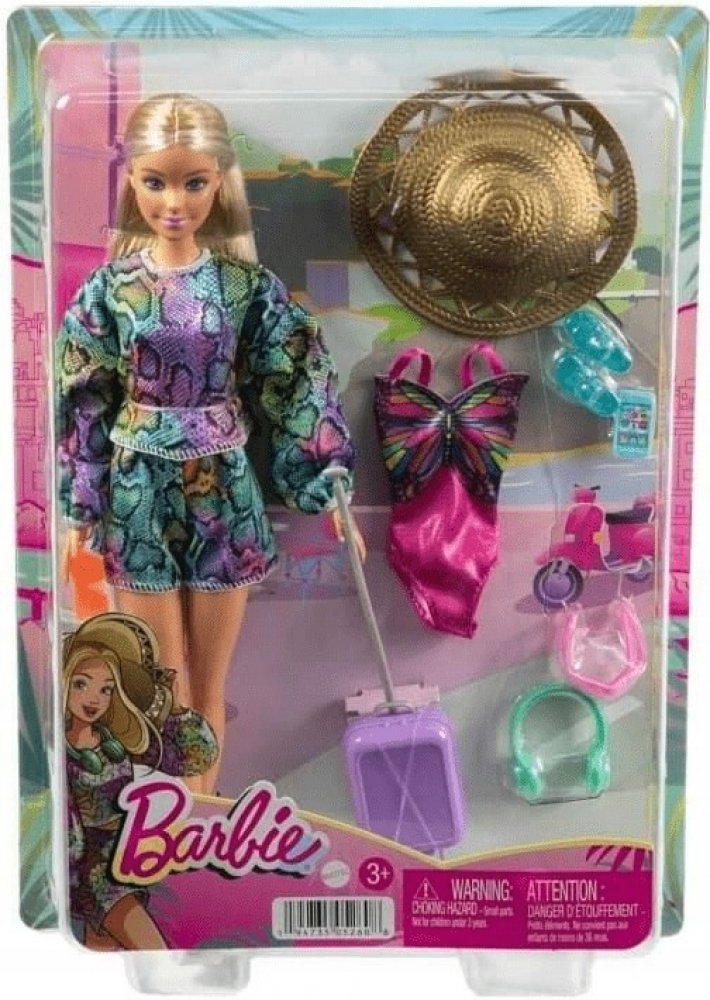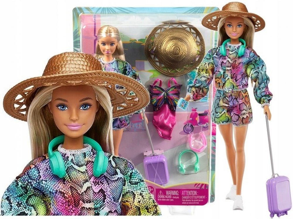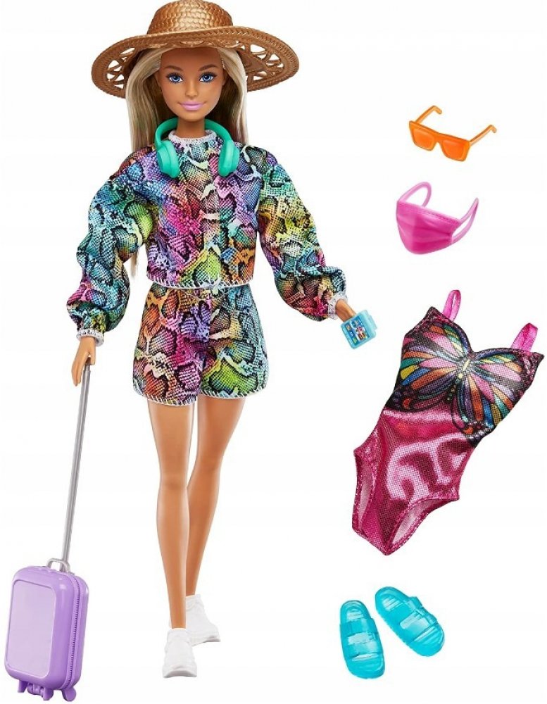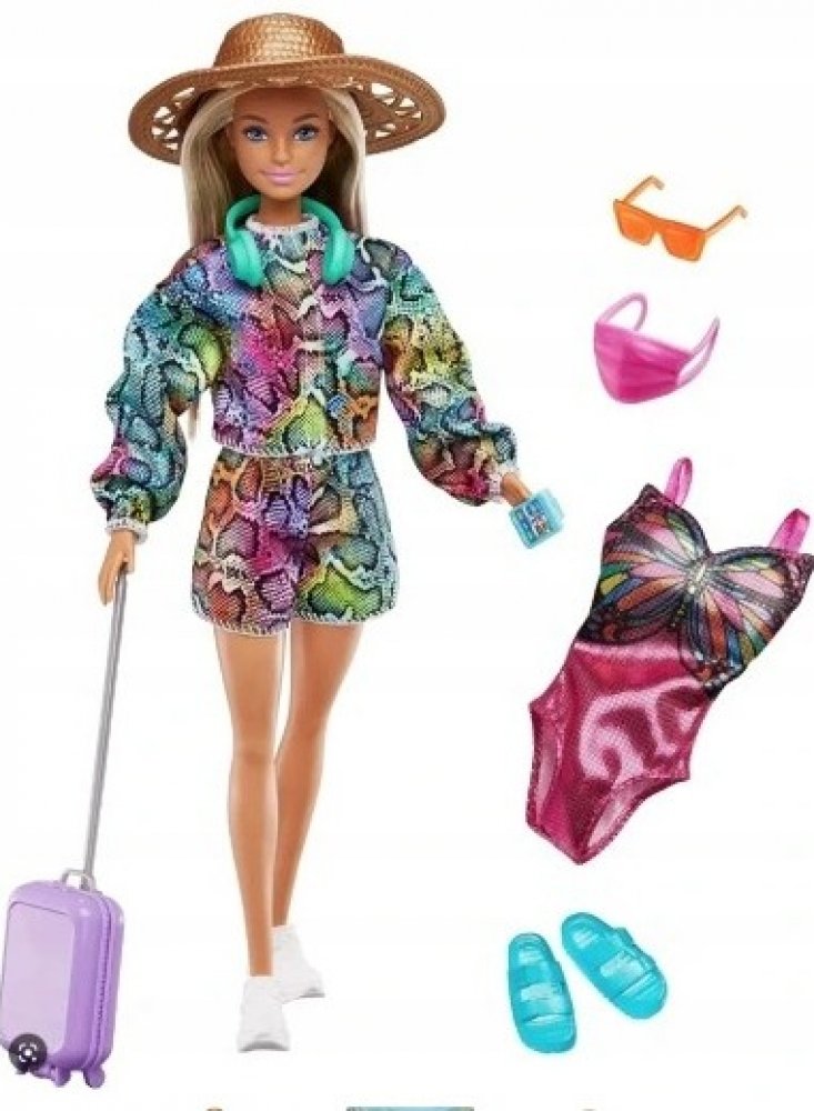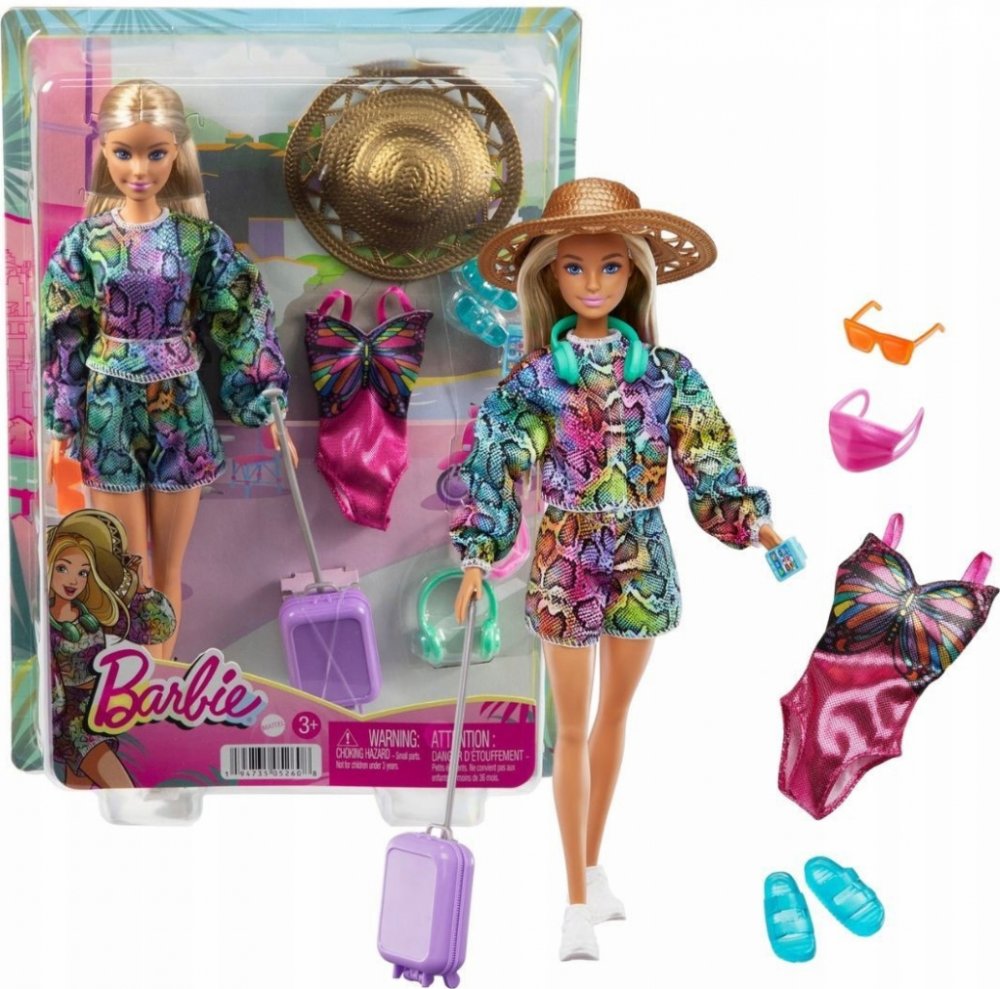 Panenka Barbie® je připravena na další velké dobrodružství se svým koťátkem a více než 10 cestovními doplňky. Ozdobte její kufr tematickým archem s nálepkami, pak jí sbalte batoh a zavazadla s cestovními nezbytnostmi včetně masky na oči, sluchátek, cestovního polštáře a toaletních potřeb! Když dorazí na místo určení, je panenka Barbie® připravena prozkoumat okolí s fotoaparátem, chytrým telefonem, čepicí a šálkem kávy. Panenka Barbie® je připravena ke vzletu v oranžové sukni, potištěném topu, trendy tašce přes pas a ležérních bílých teniskách.