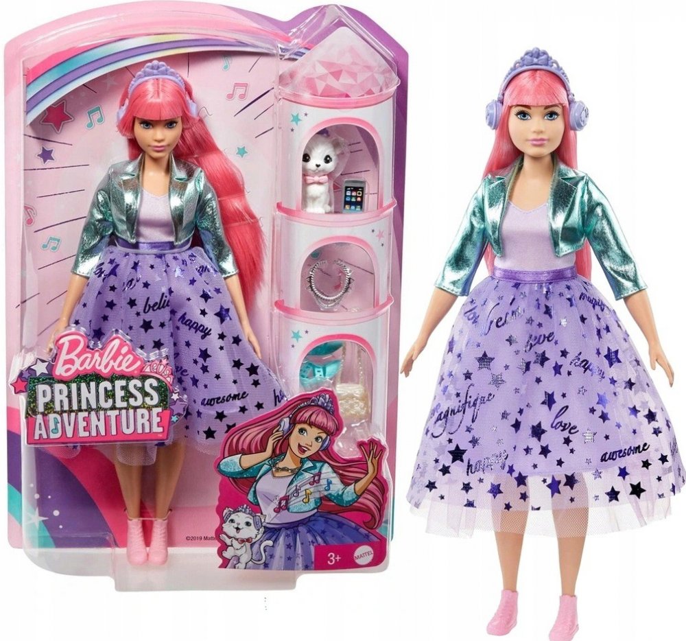Připoj se k panence Barbie a její kamarádce Daisy a užijte si společně spoustu nejrůznějších královských dobrodružství. Tato kolekce panenek je inspirována oblíbeným filmem Princess Adventure, který vznikl na motivy populárního seriálu Barbie Dreamhouse Adventures. Panenky jsou oblečeny do pestrobarevných princeznovských oblečků v kombinaci s moderními kousky. Metalická bundička spolu s bohatou třpytivou sukní tvoří zajímavou a neotřelou kombinaci. Součástí každé panenky je i rozkošný zvířecí kamarád a stylové doplňky jako například botky, kabelka, náhrdelník nebo čelenka, s kterými si užiješ ještě více zábavy při vymýšlení nejrůznějších příběhů.