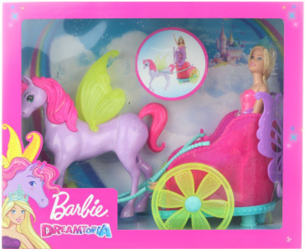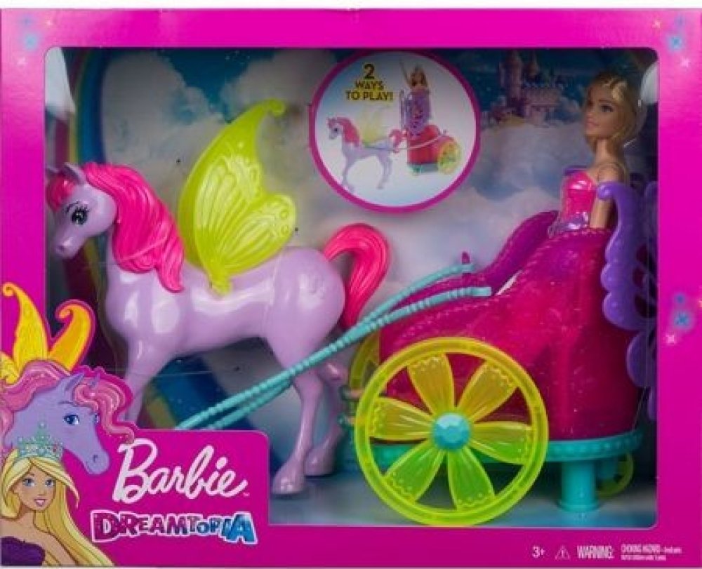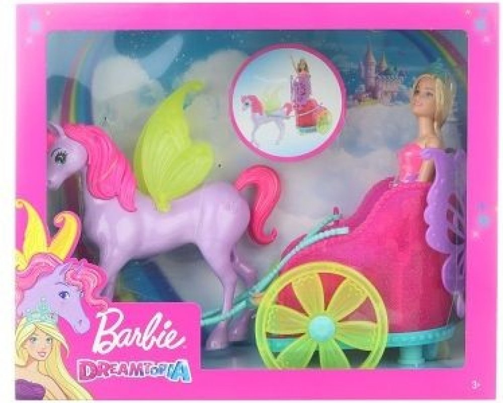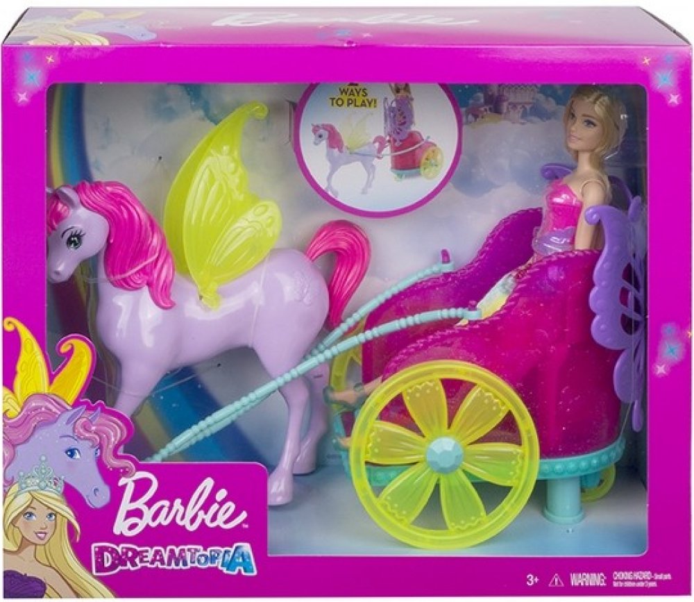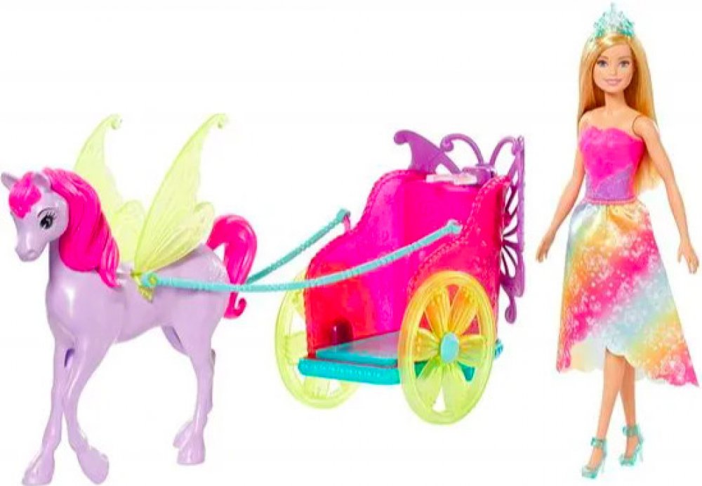Užij si spoustu zábavy a parádních dobrodružství s princeznou Barbie. Vydejte se společně na projížďku v jejím pestrobarevném kočáře, který je tažen překrásným koníkem s křídly, která se opravdu třepotají! Panenka Barbie může jet v kočáře hned dvěma způsoby. Usaď panenku do kočáru, nebo ji postav za kočár a sleduj, jak se za ní budou všichni v úžasu otáčet. Princezna Barbie se při této příležitosti oblékla do pestrobarevného oblečku, který ozvláštňuje sukýnka s prodlouženým zadním dílem, kouzelné detaily a odnímatelná korunka.