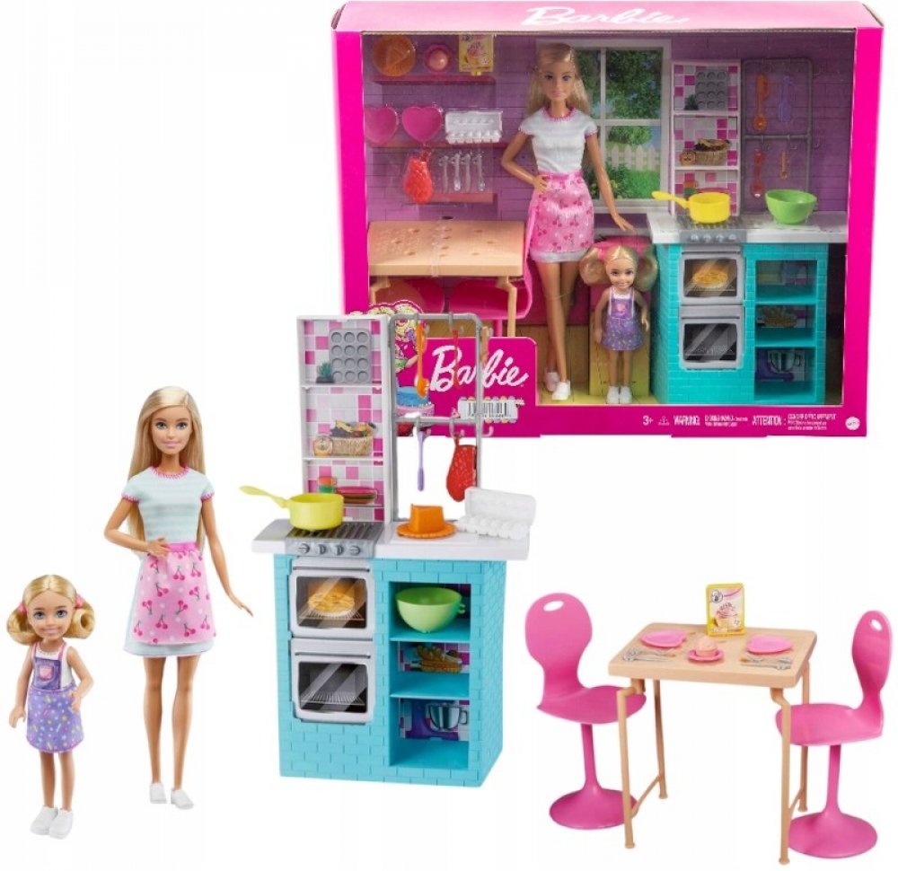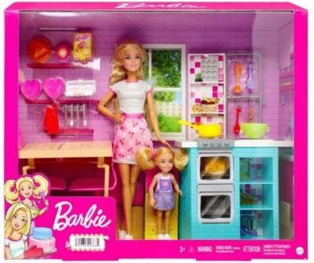 Připravte se na skvělou zábavu při pečení s tímto setem, ve kterém najdete panenku Barbie, její mladší sestru Chelsea a vše, co potřebují k přípravě sladkého pečiva. Součástí balení je kuchyňské stanoviště s dvojitou troubou, sporákem, policemi a praktickými háčky na kuchyňské náčiní. Panenky Barbie a Chelsea mohou připravovat a kamna dobroty pomocí více než 15 doplňků, jako jsou kuchyňské potřeby, přísady a další. Po skončení vaření mohou panenky podávat své sladkosti hostům a pak sedět za stolem s židličkami a vychutnávat si pečivo.