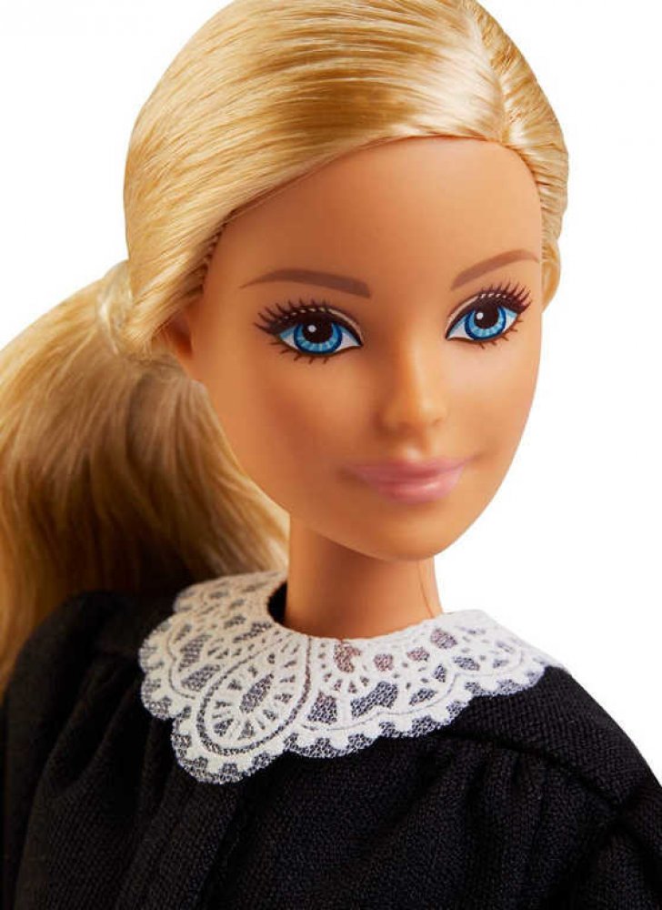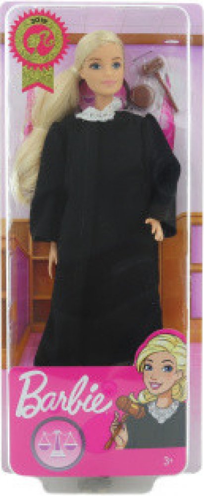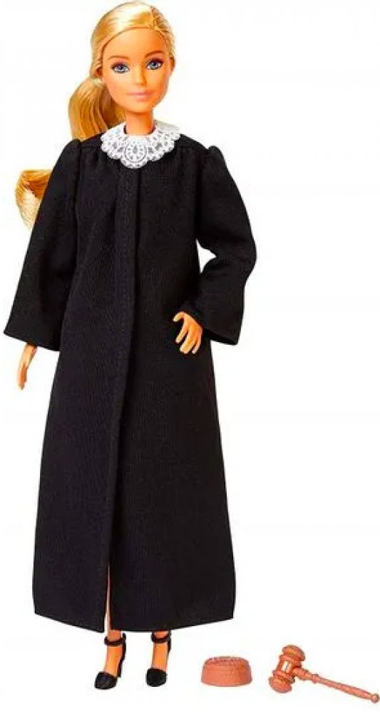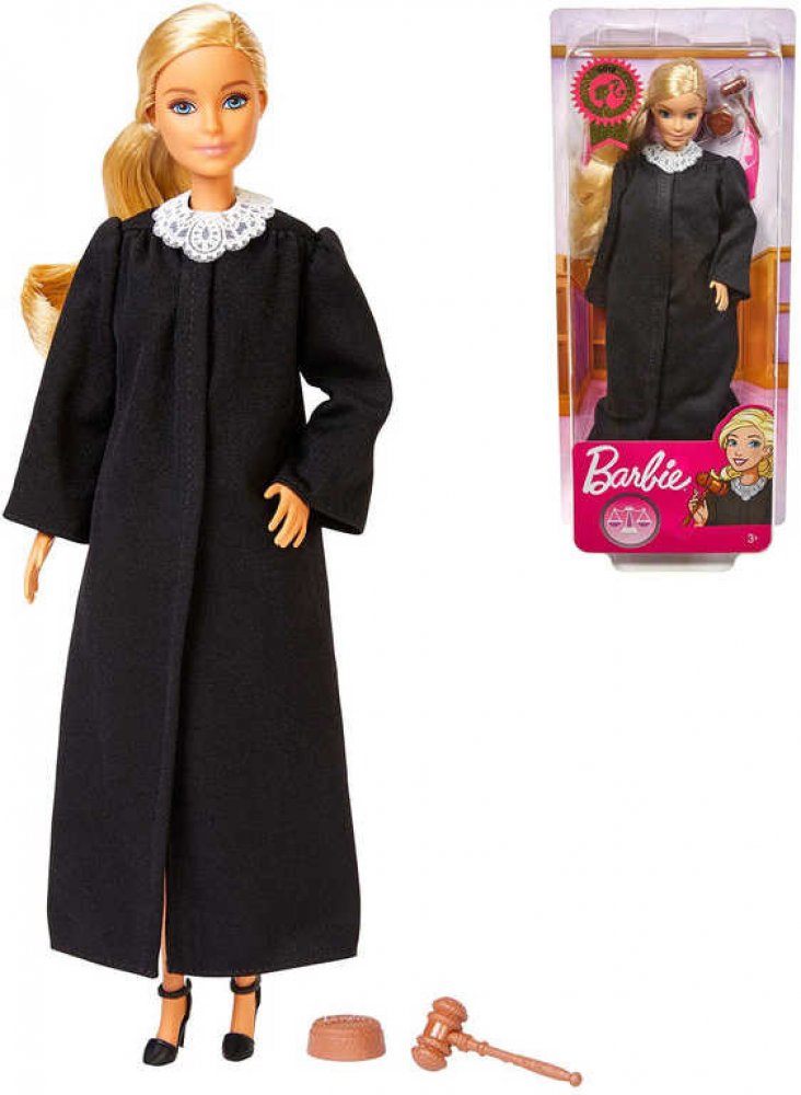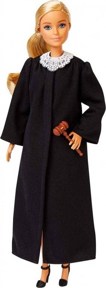 Panenka Barbie coby soudkyně, v charakteristickém černém taláru, s tematickými doplňky.