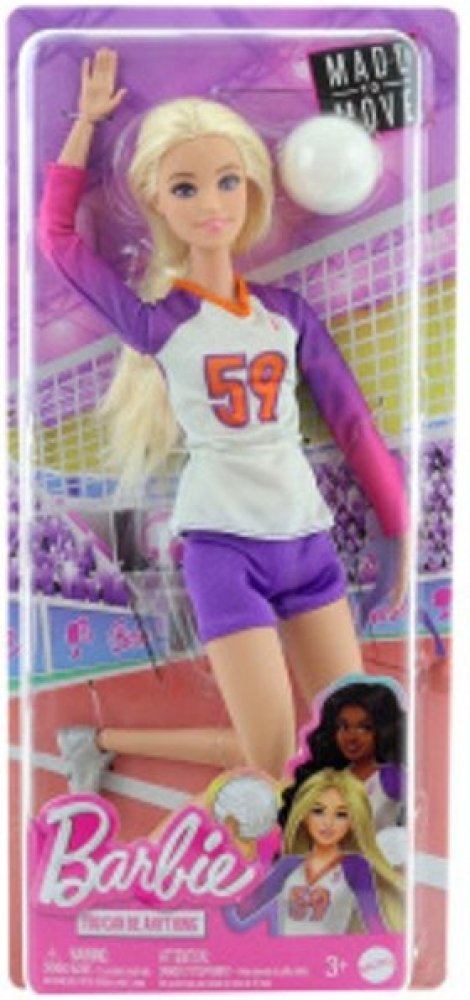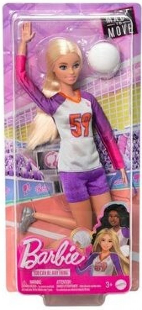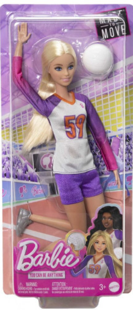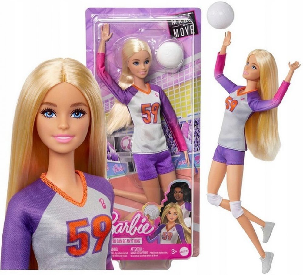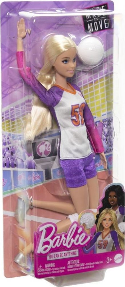 Volleyballová panenka Barbie Made to Move je připravena ke hře! Má 22 kloubů, takže jí děti mohou pomáhat podávat, přihrávat a kopat do míče i v setu. Je vždy připravena ke hře, přichází oblečená v oblečku s tílkem, šortkami a chrániči kolen. Do toho číslo 59! Děti mohou snít a představovat si, čím vším se mohou stát s panenkami Barbie Career! Panenka nemůže stát samostatně. Barvy a ozdoby se mohou lišit. Tato panenka Barbie volejbalová šampionka je připravena skórovat!" Má 22 kloubů, takže jí děti mohou pomáhat podávat, odpalovat a hrát z branky. Panenka Barbie je připravena hrát, oblečená do jednotného oblečku s topem, šortkami a chrániči kolen. Součástí balení je volejbalový doplněk. Děti mohou panence Barbie pomáhat trénovat a hrát. Sada panenky a doplňků je skvělým dárkem pro děti od 3 let, zejména pro ty, které milují sport! .