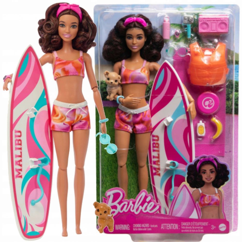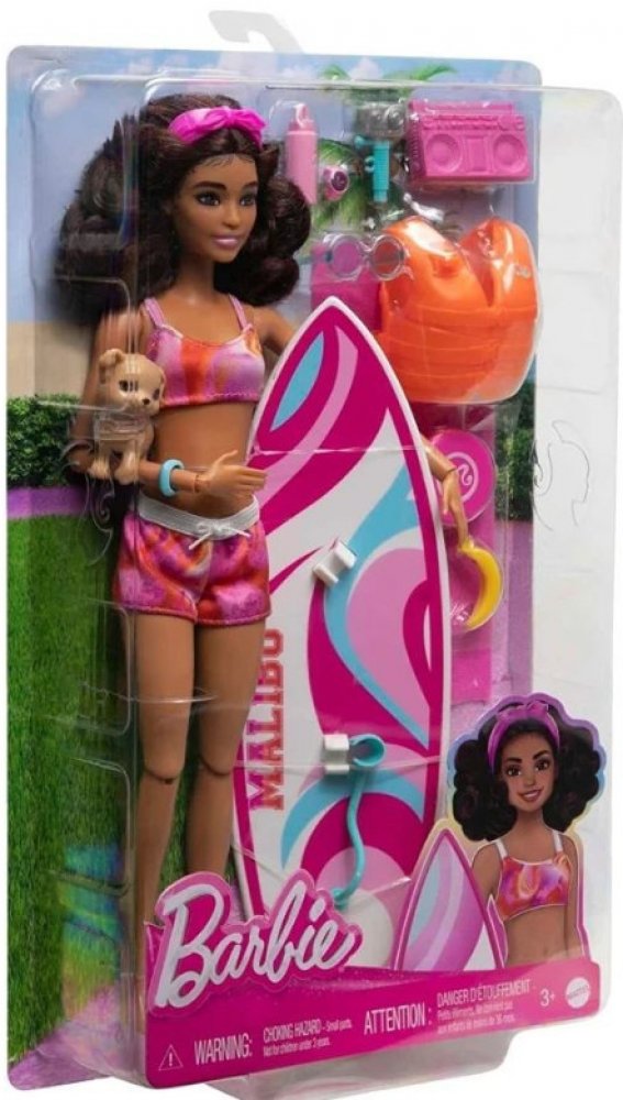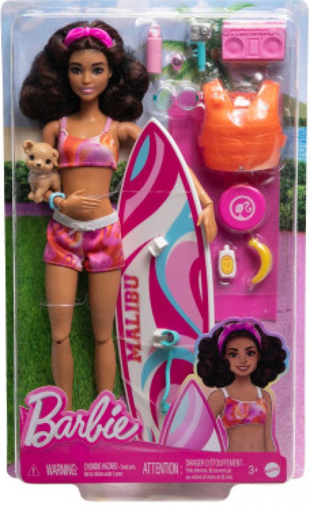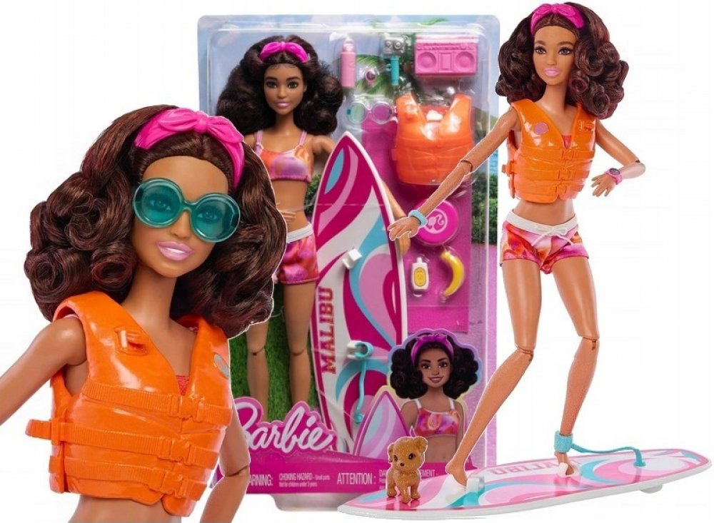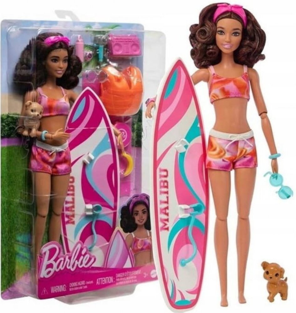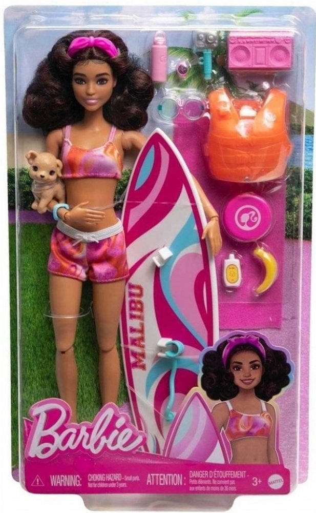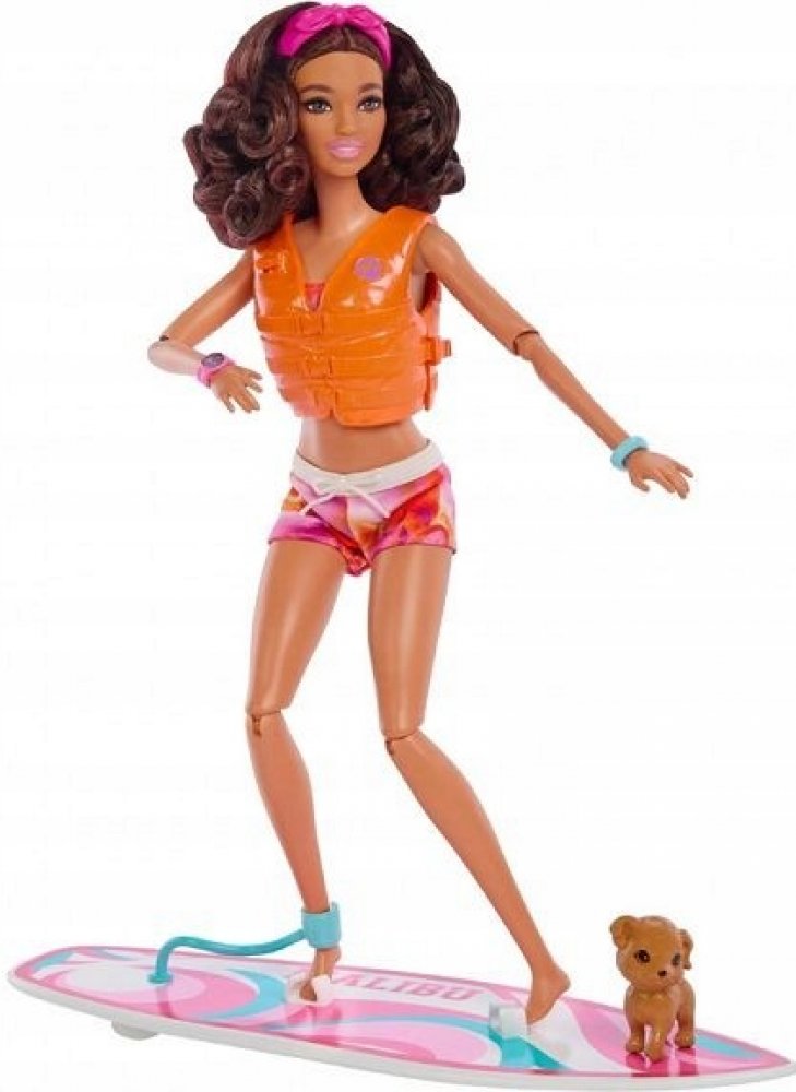 Součástí balení je surfovací prkno, štěňátko a tematické doplňky. Surfovací prkno s groovy potiskem drží panenku na místě pomocí klipů na nohy a řemínku na kotník, zatímco ona se prohání na vlnách. Panenka Barbie® má na sobě sportovní plavecký obleček s čelenkou a je dodávána s hravým štěňátkem. Je pořádně natěšená na zábavu na slunci a má polohovatelné tělo, které umožňuje realistický pohyb! Mezi další doplňky patří záchranná vesta, ručník, stereo, frisbee, sluneční brýle, láhev s vodou, opalovací krém, banán a další. Panenka neumí samostatně stát. Barvy a vzhled výrobku se mohou lišit.