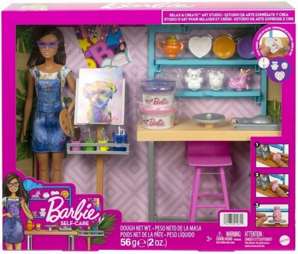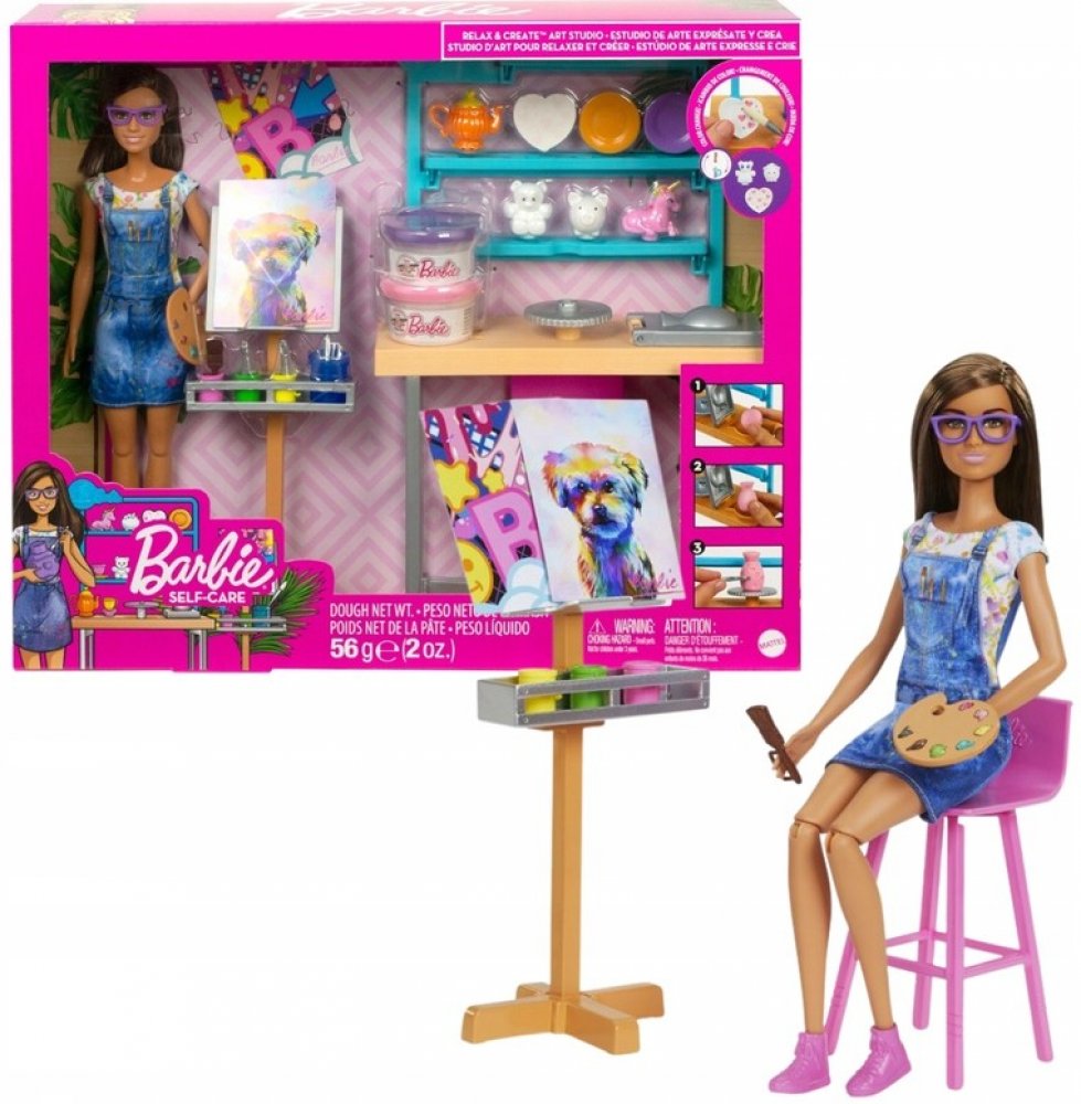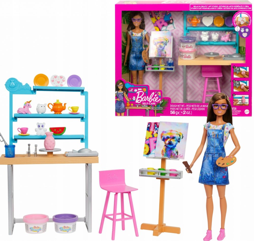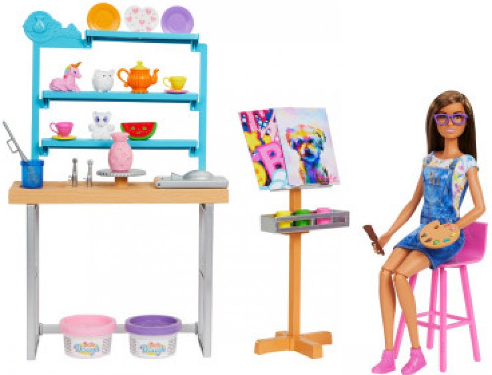 Připojte se k Barbie Uměleckém ateliéru Vyjměte hmotu z nádoby a vyválejte z ní kuličku tu umístěte do formy přitlačte Poté postavte vytvořenou vázu na otočný kruh a vyberte si razítko srdíčka nebo hvězdičky. Otočte kruhem aby se na výtvor udělal otisk. Namočte houbičkový štětec do ledově studené vody a natřete bílé kousky malé prasátko má na zádech modré skvrny talířek ve tvaru srdce má růžová srdíčka a medvídek má fialové oči. Děti si mohou s hmotou hrát a tvořit znovu a znovu Panenka Barbie může také předstírat že maluje má na výběr ze dvou barevných pláten. Herní set obsahuje panenku Barbie s ohebnými koleny a více než 25 dílků. Panenka neumí samostatně stát. Barvy a vzhled výrobku se mohou lišit. Pro děti od 3 let.