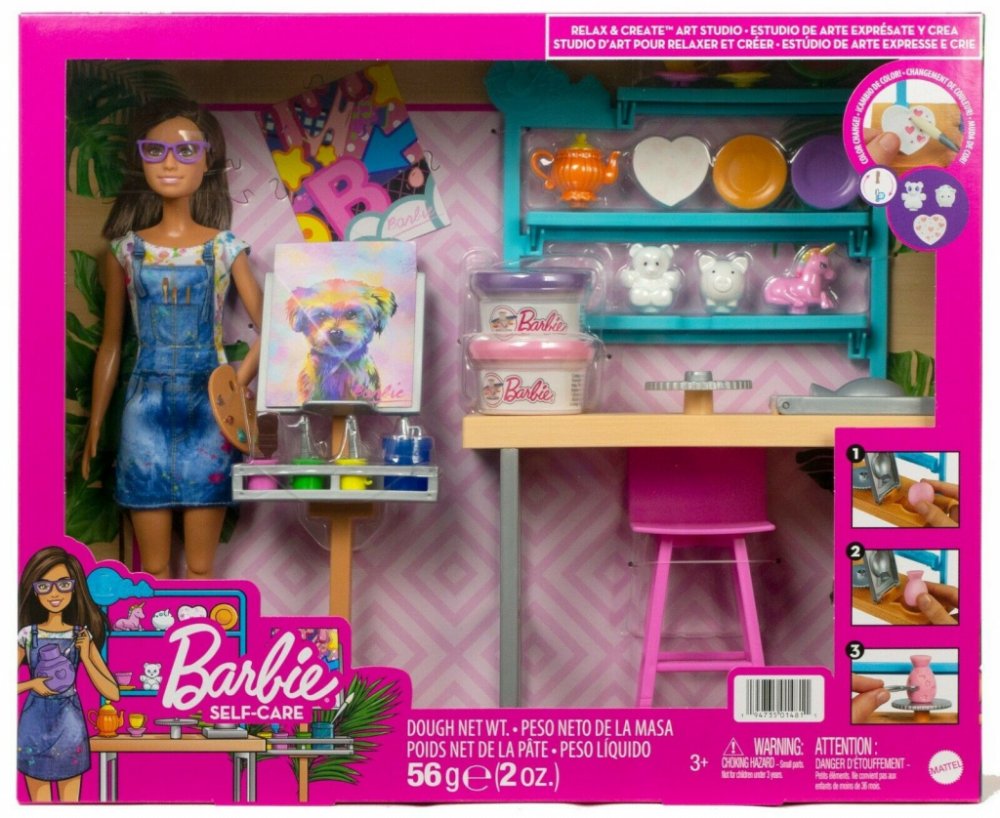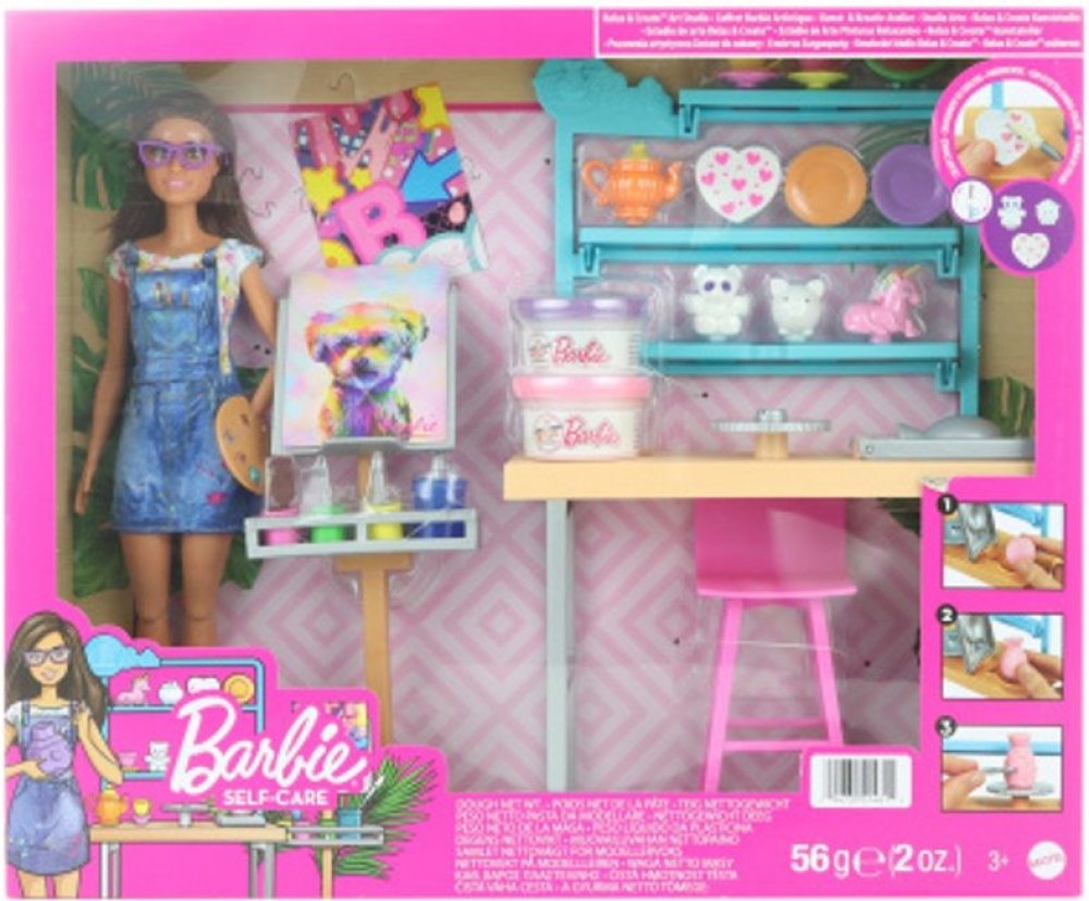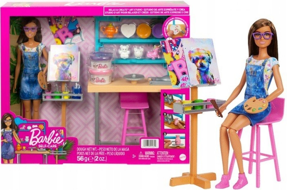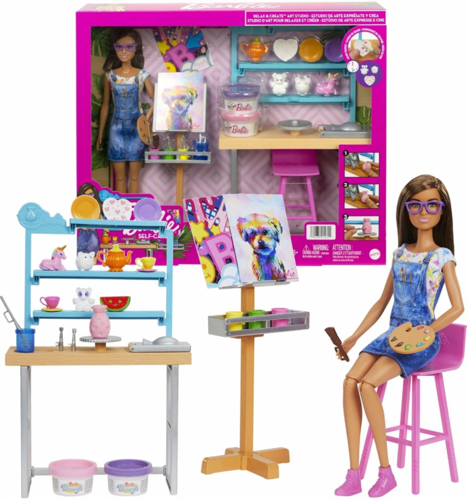 Připojte se k Barbie Uměleckém ateliéru Vyjměte hmotu z nádoby a vyválejte z ní kuličku tu umístěte do formy přitlačte Poté postavte vytvořenou vázu na otočný kruh a vyberte si razítko srdíčka nebo hvězdičky. Otočte kruhem aby se na výtvor udělal otisk. Namočte houbičkový štětec do ledově studené vody a natřete bílé kousky malé prasátko má na zádech modré skvrny talířek ve tvaru srdce má růžová srdíčka a medvídek má fialové oči. Děti si mohou s hmotou hrát a tvořit znovu a znovu Panenka Barbie může také předstírat že maluje má na výběr ze dvou barevných pláten. Herní set obsahuje panenku Barbie s ohebnými koleny a více než 25 dílků. Panenka neumí samostatně stát. Barvy a vzhled výrobku se mohou lišit. Pro děti od 3 let.