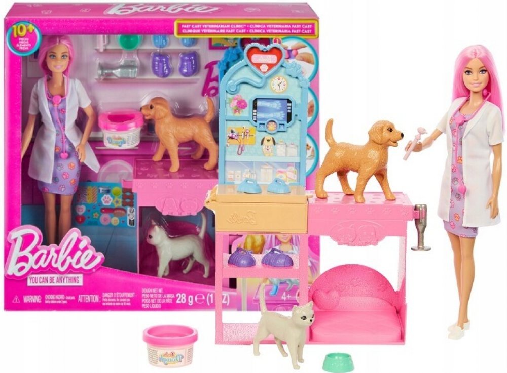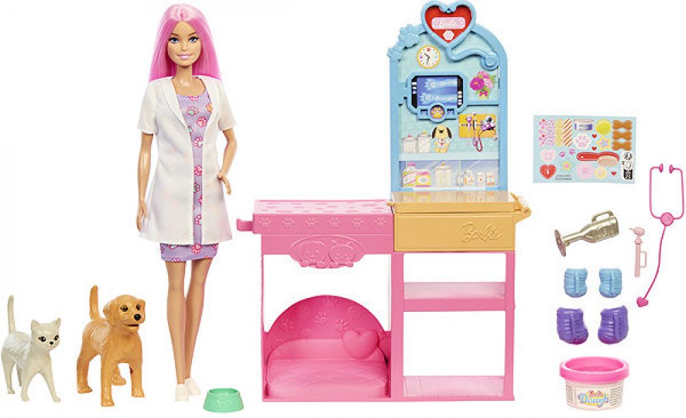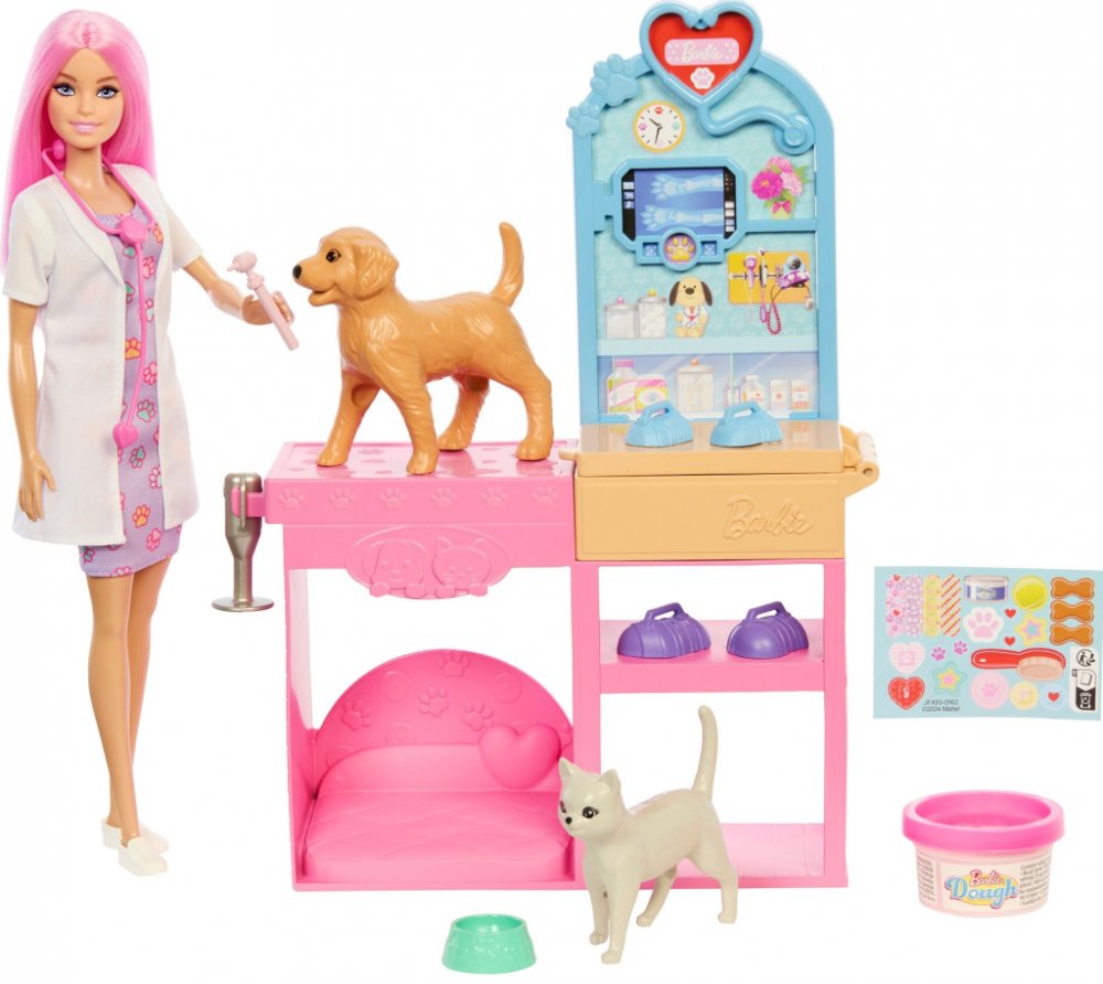 Se setem BARBIE veterinářka si děti zahrají na péči o mazlíčky, vyšetření i léčbu. Obsahuje Barbie s růžovými vlasy, veterinární stanici, kočku a psa, modelovací hmotu na „sádry“ a více než 10 tematických doplňků pro kreativní a realistickou hru na ordinaci.
