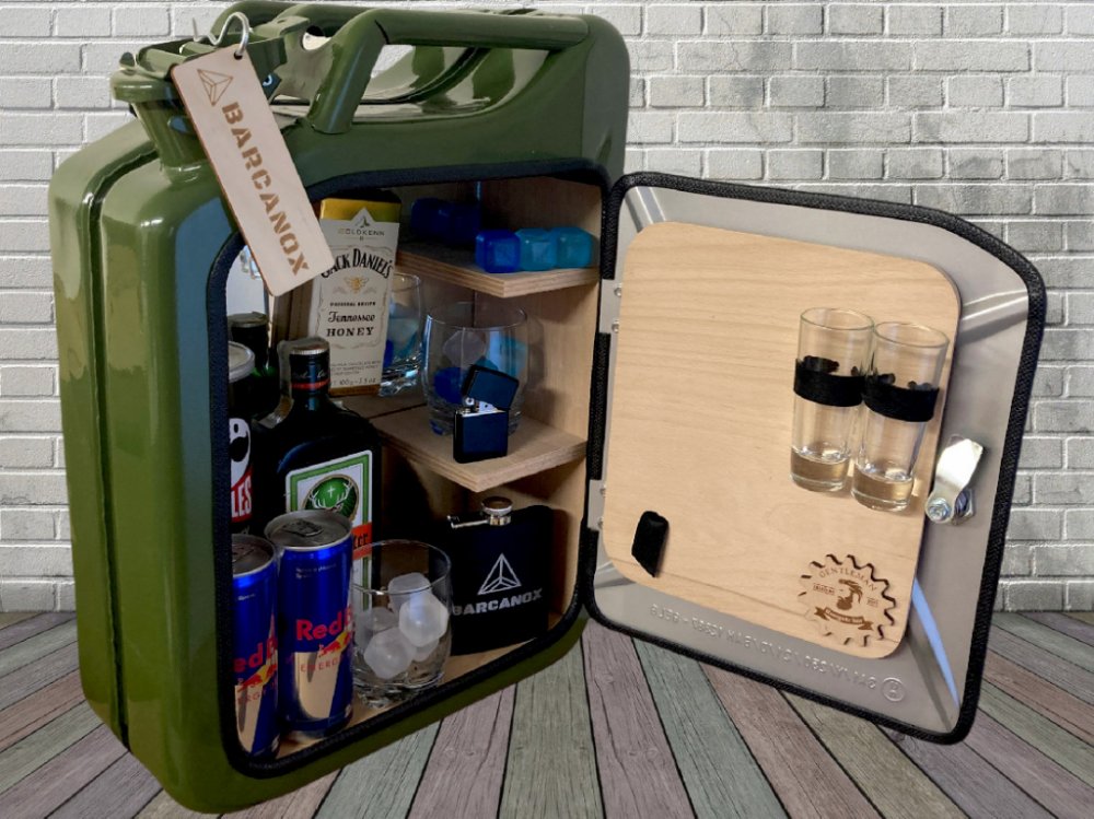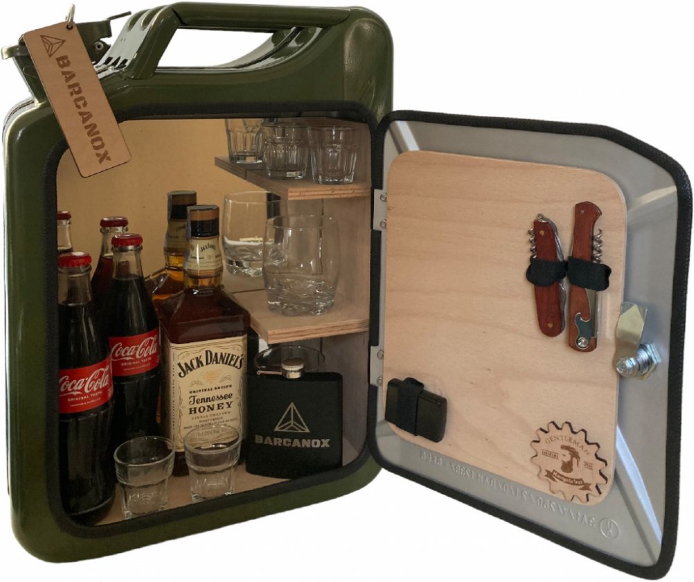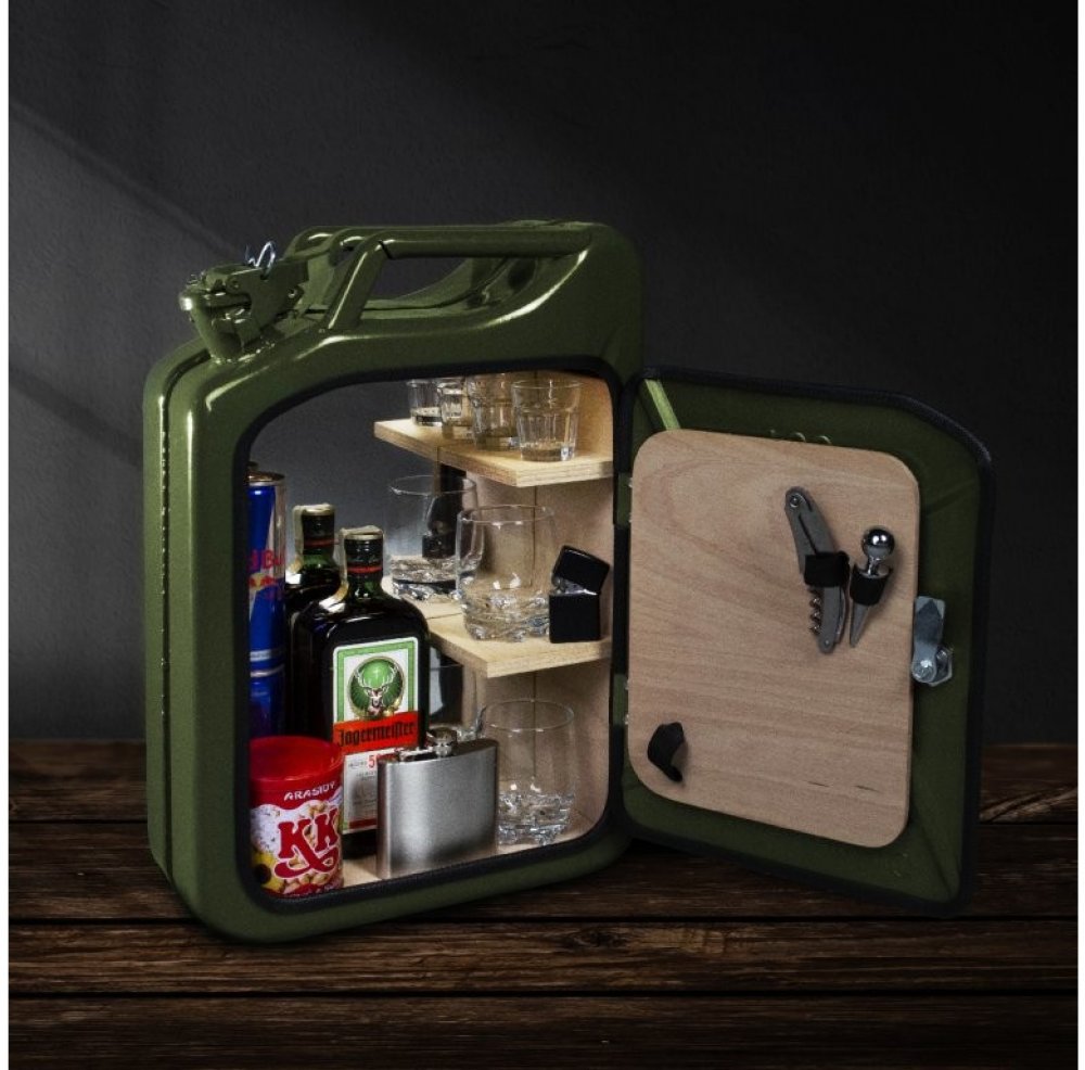 Hledali jste ideální dárek pro muže? Tak už nehledejte, našli jste náš kanystr bar, který slouží jako minibar pro úschovu oblíbeného alkoholu. Tento bar se pyšní naprosto jedinečným designem, který mu vdechl 20 l vojenský kanystr z kterého je zhotoven. Vnitřek kanystru je osazen překližkou v kombinaci se zrcadlem, které mu dodává správný barový nádech. Tento vnitřní prostor je primárně určen až pr...