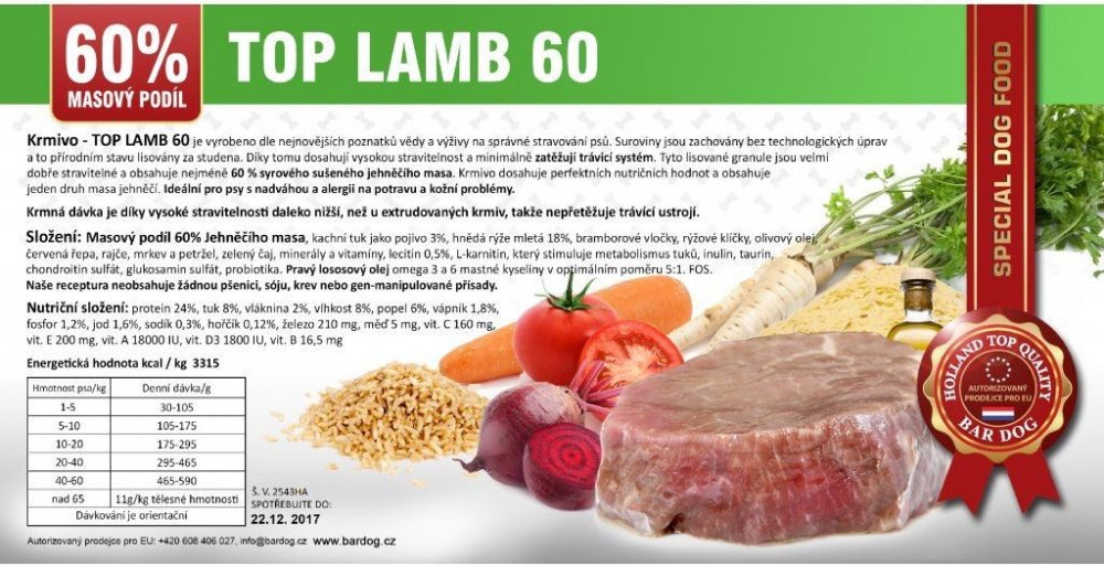 Krmivo - TOP LAMB 60 je vyrobeno dle nejnovějších poznatků vědy a výživy na správné stravování psů. Suroviny jsou zachovány bez technologických úprav a to v přírodním stavu. Obsah sušeného jehněčího masa je nejméně 60 %.