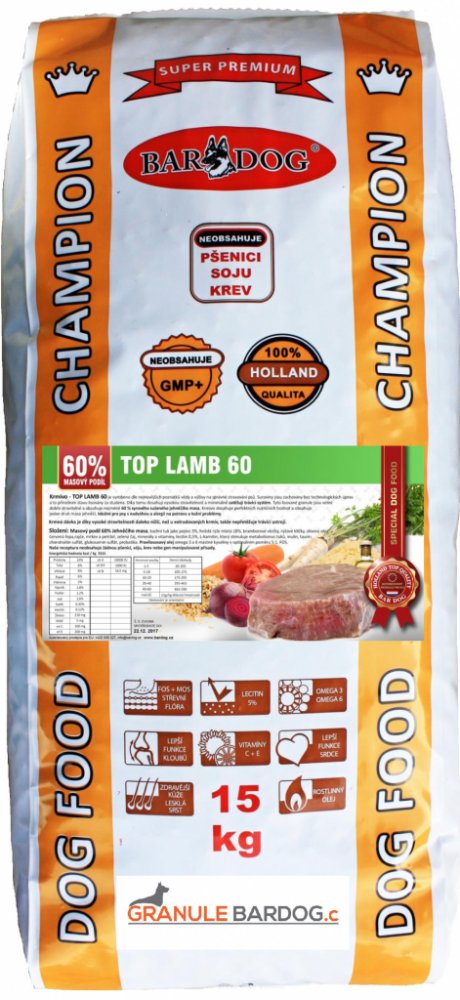 Krmivo TOP Lamb 60 je vyrobeno dle nejnovějších poznatků vědy a výživy na správné stravování psů . Suroviny jsou zachovány bez technologických úprav a to přírodním stavu lisovány za studena. Díky tomu dosahují vysokou stravitelnost a minimálně zatěžují trávicí systém. Tyto lisované granule jsou velmi dobře stravitelné a obsahuje nejméně 60 % sušeného jehněčího masa. Krmivo dosahuje perfektních nutričních hodnot a obsahuje jeden druh masa jehněčí. Ideální pro psy s nadváhou, starší psy a pro psy trpící potravinovou alergií na jiné druhy masa.