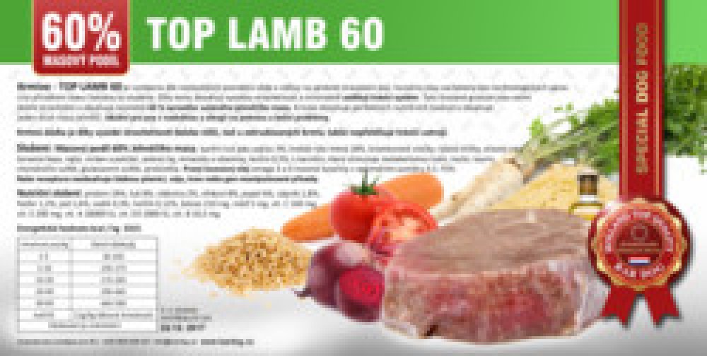 Složení: Masový podíl 60% jehněčího masa, kachní tuk jako pojivo 3%, hnědá rýže mletá 18%, bramborové vločky, rýžové klíčky, olivový olej, červená řepa, rajče, mrkev a petržel, zelený čaj, minerály a vitamíny, lecitin 0,5%, L-karnitin, který stimuluje metabolismus tuků, inulin, taurin, chondroitin sulfát, glukosamin sulfát, probiotika. Pravý lososový olej omega 3 a 6 mastné kyseliny v optimálním poměru 5:1. FOS.
