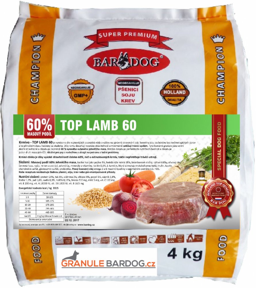 Kompletní hypoalergení krmivo pro psy, lisované za studena, vyvinuto pro psy s alergií na obiloviny a jiné druhy mas. Granule Bardog obsahují 60% sušeného jehněčího masa a žádně jiné maso. Nízká krmná dávka snižuje nároky na trávící systém psa a náklady na dopravu jeho majitele. Krmivo se sníženým množstvím tuku je vhodné i jako dieta pro psy s nadváhou. V krmivo Bardog se díky šetrnému zpracování přirozeně vyskytuje dostatečné množství glukosamin sulfátu a chondroitinu pro zdraví pohybového aparátu. Jako další neopomenutelné složky jsou Olivový olej jako zdroj mastných kyselin a prostředí pro rozpouštění vitamínů. Lístky zelného čaje obsahující řadu antioxidantů. U lisovaných granulí nedochází k bobtnání v žaludku psa a předchází se tak možné torzi žaludku. Receptura Bardog neobsahuje žádnou pšenici, sóju, krev nebo gen-manipulované přísady.