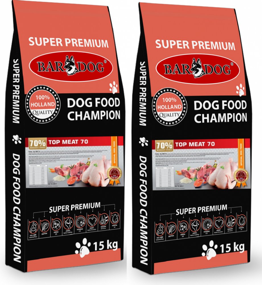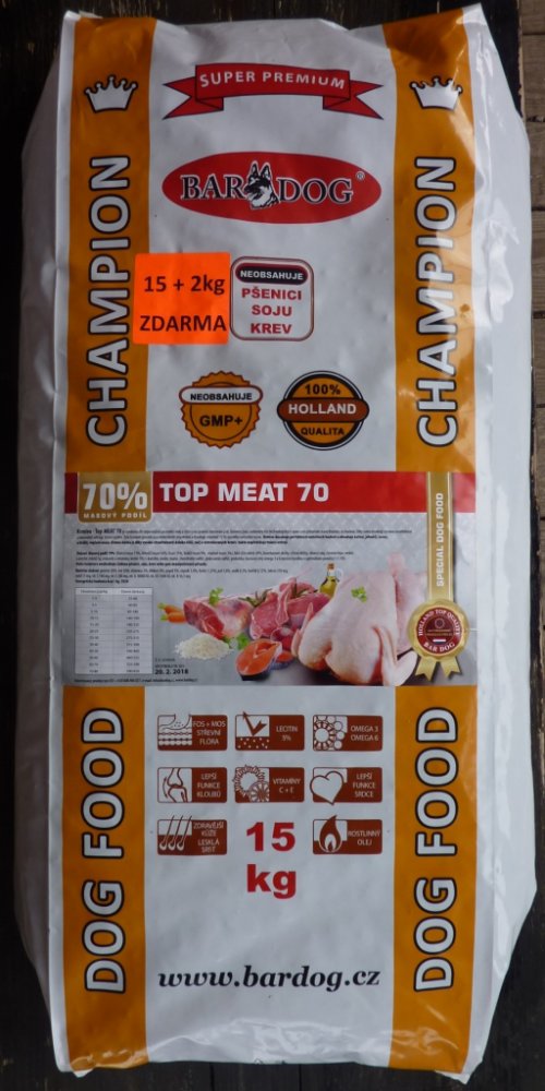 Bardog pro dospělé pro všechna plemena s vysokou aktivitou kuřecí Bardog 30 kg superprémiové suché 20.0 mm Top Meat 70 28 % rýže Bardog Top Meat 70 z České republiky střední (200-500mg) 16 % 3 % 1.4 % 1.25 % 5 % 0.3 % 0.12 % vysoká deklarováno (>40%) standardní základní snadný přechod pasivní (prebiotika) možné částečná (země výroby)