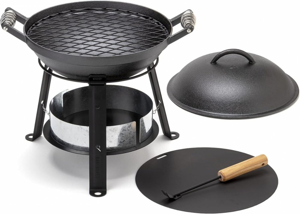 Litinový gril All-in-One BAREBONES Litinový gril All-in-One je snem všech venkovních kuchařů. Tento univerzální gril kombinuje litinovou základnu, klenuté víko, grilovací rošt, pečicí ocel, stativ a tác na uhlí do jednoho praktického balení, které vám umožní nespočet konfigurací a rozšiřuje vaše možnosti venkovního stolování. Po skončení vaření lze všechny komponenty snadno zabalit do jednoho kompaktního svazku, což minimalizuje množství věcí, které musíte nosit. Klíčové vlastnosti: Pevná, odolná litinová konstrukce: Zajišťuje dlouhou životnost a odolnost vůči vysokým teplotám. Multifunkční litinové tělo: Slouží jako varná plocha i grilovací základna. Kompatibilní s otevřeným ohněm a uhlím: Umožňuje flexibilní možnosti vaření a grilování v různých prostředích. Funguje s přímým i nepřímým teplem: Poskytuje různé způsoby vaření podle potřeby. Včetně grilovacího roštu: Ideální pro grilování a vaření v páře. Pečicí ocel: Nahrazuje pánev a poskytuje rovnoměrné rozložení tepla. Nastavitelný tác na dřevěné uhlí: S ochranou proti větru pro efektivní spalování. Použití se stativovým stojanem nebo bez něj: Stativ funguje s grilovacím roštem pro stabilní vaření. Snadné skladování: Veškeré příslušenství se vejde dovnitř grilu. Přenosná boční madla: Umožňují snadné přenášení. Jednoduchá péče a čištění: Ošetřeno slunečnicovým olejem pro snadnou údržbu. Položky v ceně: Podstavec wok Vyklenuté víko Grilovací rošt Ocel/plotna na pečení Zvedák podnosu Stojan na stativ Nastavitelný podnos na uhlí Ochrana proti větru Pás Specifikace: Rozměry: 37,5cm x 32,5cm x 47,5cm Hmotnost: 11,6kg Kapacita: 4 litry s prostorem pro vaření