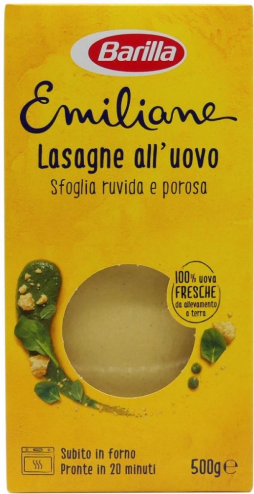 Těstoviny s čerstvým vejcem Široké, ploché listy Lasagny byly původně připraveny Římany na způsob těstovin. Teprve později se Lasagne vařily ve velké pánvi a pak se skládaly střídavě mleté maso, sýr a rajčata. Hotová Barilla Lasagna nevyžaduje předchozí vaření ve vodě - stačí ji dát přímo do formy a připravit v troubě.Na rozdíl od klasických lasagní je All'Uovo Lasagne vyrobena z vajec.Lasagne, nejznámější recept mezi italskými těstovinami připravenými v troubě, se liší region od regionu. V Toskánsku a Emilii Romagna se připravují s bešamelem, masovou omáčkou a strouhaným parmazánem. Ligurové ji připravují s pestem. Ochutnejte hotové lasagne s masovými omáčkami, jako je tradiční boloňská omáčka, smetanovými omáčkami jako klasickým bešamelem a zeleninovými omáčkami.