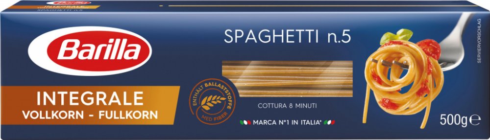 Celozrnné těstoviny Barilla Spaghetti, jsou vyrobené ze 100% celozrnné pšenice, a proto jsou vynikajícím zdrojem vlákniny. Tyto těstoviny jsou ideální pro každého, kdo se snaží zvýšit příjem vlákniny a celozrnné mouky, aniž by došlo ke ztrátě chuti.