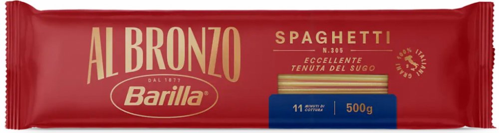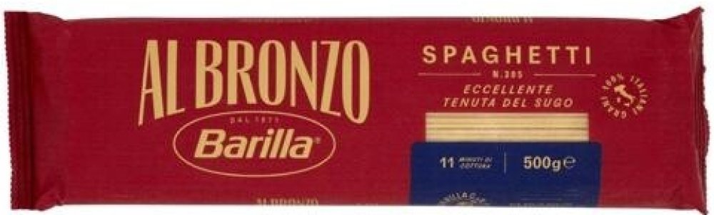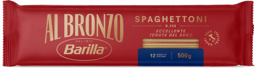 Barilla Spaghettoni Al Bronzo se vyznačují jantarově žlutou barvou a dostatečnou tloušťkou. Speciální bronzová kresba díky metodě Lavorazione Grezza dodává těstovinám intenzivní drsnost, která je činí neodolatelnými pro oči i chuťové buňky. Spaghettoni Al Bronzo se skvěle hodí k jakékoli omáčce, a poskytují tak mimořádný chuťový zážitek.