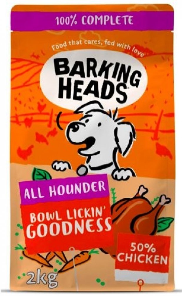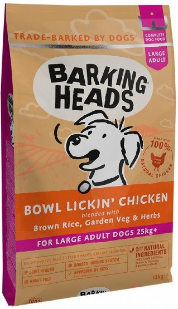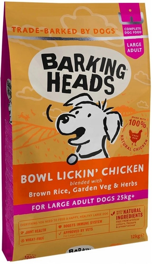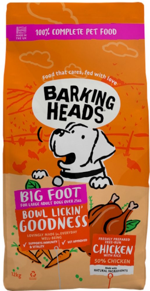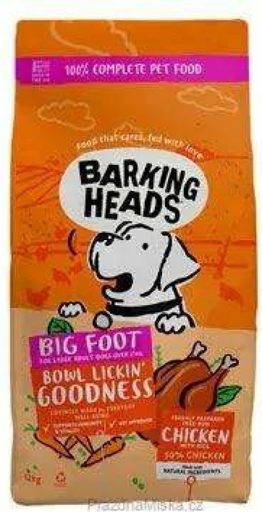 BARKING HEADS Big Foot Bowl Lickin Good Chick 12kg - Kompletní suché krmivo pro dospělé psy velkých plemen. - Receptura "Big Foot Bowl Lickin' Goodness Chicken" obsahuje vysoké procento kuřecího masa. Dále je ve složení také optimální poměr tuků a vyvážené množství vápníku a fosforu pro silné kosti. Krmivo je určeno pro dospělé psy velkých a obřích plemena. Navíc obsahuje přípravek pro péči o kyčl...