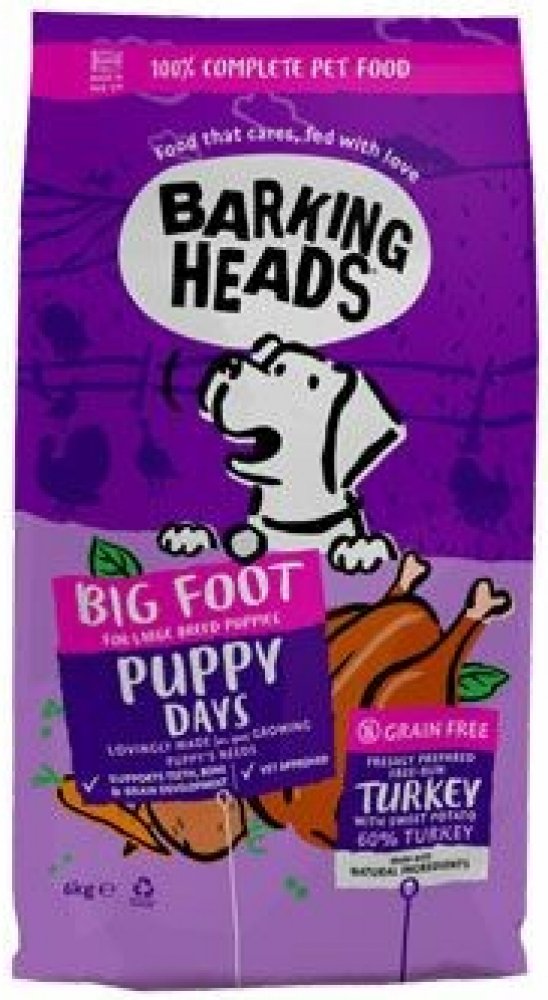 Kompletní suché krmivo pro štěňata velkých plemen. Recept: 33 % čerstvě připravená krůta, odpovídá 38g na 100g. Složení: krůta 60 % (33 % čerstvě připravené krůty z volných výběhů, 23 % sušená krůta, 4 % masová šťáva z krůt), batáty (14 %), brambory, hrách (10 %), bramborová bílkovina, vojtěška, lososový olej (1 %), minerály, produkty z kvasinek (1000 mg/kg), extrakt z kořene čekanky (fruktooligosacharidy 1000 mg/kg), mořské řasy, glukosamin (500 mg/kg), sušená mrkev (500 mg/kg), směs bylin (máta peprná, rozmarýn, oregano a tymián 500 mg/kg), beta glukany (300 mg/kg), chondroitin-sulfát (150 mg/kg) Analytické složky (%): Hrubý protein 30 %, hrubý tuk 16 %, hrubá vláknina 3 %, hrubý popel 8,5 %, vápník 1,4 %, fosfor 1 % Přidané látky (na 1 kg):Vitamíny: vitamín A 18 000 IU, vitamín D3 1 000 IU, taurin 1000 mg, Vitamin E 150 mg Stopové prvky: železo (monohydrát síranu železnatého) 60 mg, zinek (monohydrát síranu zinečnatého) 50 mg, mangan (monohydrát síranu manganatého) 50 mg, zinek (chelát zinku jako hydrát glycinu) 15 mg, měď (síran měďnatý pentahydrát) 5 mg, jód (jodičnan vápenatý bezvodý) 1,5 mg, selen (selenit sodný) 0,05 mg Energetická hodnota: 385 kcal/100g Dávkovací tabulka: Předpokládaná hmotnost v dospělosti Stáří štěněte (měsíce) Denní množství 25 kg 2–6 205-355 g 6–12 355–360 g 35 kg 2–6 260–455 g 6–12 455–465 g 45 kg 2–6 275–540 g 6–12 540–560 g 12-18 560-540 g 55 kg 2–6 280–615 g 6–12 615–655 g 12-18 610-595 g 60 kg+ 2–6 300–660 g 6–12 660–700 g 12–18 700–685 g