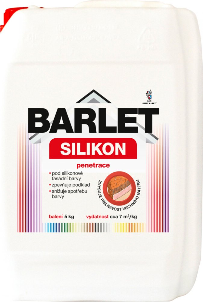 BARLET silikon penetrace je penetrační nátěr pod silikonovou fasádní barvu. Penetrační nátěr na savé omítky pro zpevnění a zlepšení přilnavosti nátěru barvou BARLET silikon. Proniká do podkladu, snižuje jeho savost a zpevňuje jej. Zajišťuje dokonalé zakotvení vrchního nátěru a snižuje jeho spotřebu. Vlastnosti penetrace BARLET silikon: vhodná penetrace pod akrylátové fasádní barvy kvalitní hloubková penetrace české výroby zvyšuje přilnavost vrchního nátěru sjednocuje savost snižuje spotřebu fasádní barvy Technické vlastnosti penetrace pod silikonové barvy: vydatnost v závislosti na savosti podkladu až 7 m²/1 kg pro podklady omítka, beton, pórobeton pod silikonové fasádní barvy prostředí interiér nebo exteriér odstín mléčně zbarvené kapaliny aplikace štětkou nebo stříkáním před použitím se neředí pro umytí nářadí lze použít vodu. Příklad nátěrového postupu penetrace: Podklad musí být suchý a vyzrálý. Nanášejte štětkou nebo válečkem v jedné nebo ve dvou vrstvách. Další vrstvy nanášejte nejdříve po dokonalém zaschnutí. Optimální teplota pro natírání je 15 až 25 °C. Manipulace s penetrací pod silikonové fasádní barvy: Při práci dodržujte základní hygienická pravidla. Výrobek není určen k nátěrům přicházejícím do přímého styku s poživatinami, krmivy, pitnou vodou ani pro nátěry dětských hraček a dětského nábytku. Výrobek je ošetřený biocidem. EUH208 Obsahuje reakční směs : 5-chlor-2-methylisothiazol-3(2H) -on [číslo ES 247-500-7] a 2-methylisothiazol-3(2H)-on [číslo ES 220-239-6] (3:1). Může vyvolat alergickou reakci. Uchovávejte mimo dosah dětí. Necítíte-li se dobře, vyhledejte lékařskou pomoc. Skladovatelnost penetrace: Výrobek si uchovává užitné vlastnosti 5 let od data výroby, v původním neotevřeném obalu. Skladujte v suchém skladu při teplotě 5 až 25 °C. Likvidace obalů a odpadů penetrace: Obaly se zbytky výrobku odkládejte na místo určené obcí ke shromažďování ostatních odpadů. Dále viz. oddíl 13 bezpečnostního list výrobku.