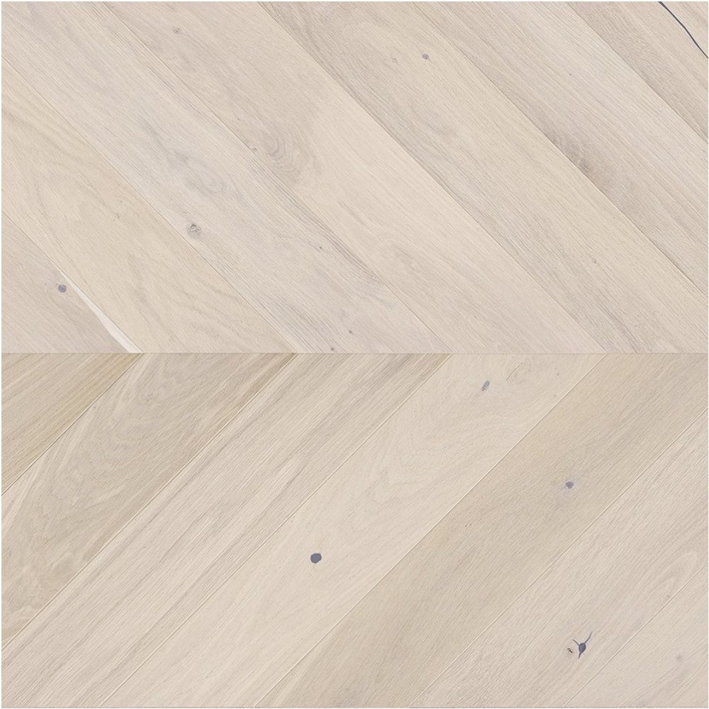 Dřevěná třívrstvá dubová parketa s francouzským vzorem, jejíž hrany jsou po celém obvodu frézovány a tvoří mikro spáry mezi jednotlivými díly. Povrch podlahy s malým množstvím suků je kartáčován, barven do světlého odstínu a ošetřen matným lakem.