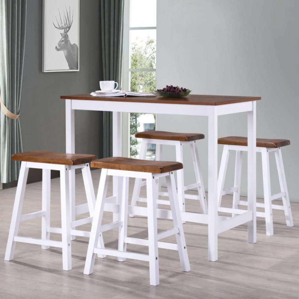 Líbí se vám vybavení jídelního koutu jako domácího baru? Pak byste mohli ocenit barový set. Obdélníkové provedení barového stolu SHUMEE se jistě bude hodit do vaší designové domácnosti. Poskytne místo pro 4 osoby. Luxusní vzhled podtrhuje lesklá povrchová úprava. Barovému stolu vévodí hnědá barva. Rozměry barového stolu SHUMEE jsou 91 × 108 × 60 cm (V׊×D). Barová židle je vysoká 60 cm a sedák 60 cm. Hlavní vlastnosti barového setu Barový stůl a stoličky sada 5 kusů z masivního dřeva 275232 Moderní barový set SHUMEE Obdélníkové vyhotovení stolu Poskytuje místo k sezení pro 4 osoby Desku stolu tvoří MDF Konstrukci stolu tvoří masiv Luxusní vzhled získá díky lesklé povrchové úpravě Barový set SHUMEE je balen i se židlemi Materiálem sedáku je MDF Barva barového setu SHUMEE je hnědá Rozměry barového stolu SHUMEE: 91 × 108 × 60 cm (V׊×D) Výška barové židle dosahuje 60 cm a sedáku 60 cm