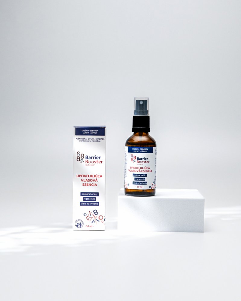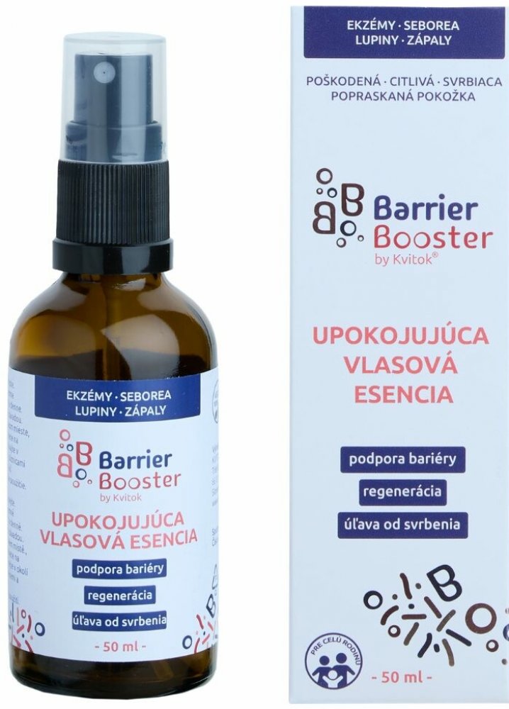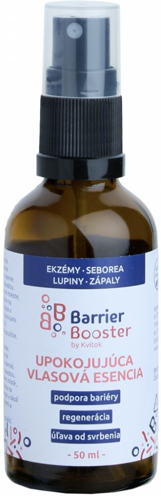 **Zklidňující vlasová esence Kvitok Barrier Booster účinně pečuje o citlivou, suchou, svědivou či podrážděnou vlasovou pokožku se sklonem k ekzému nebo seboree.** Esence **jemně hydratuje a zklidňuje pokožku hlavy** bez zatížení vlasových kořínků.