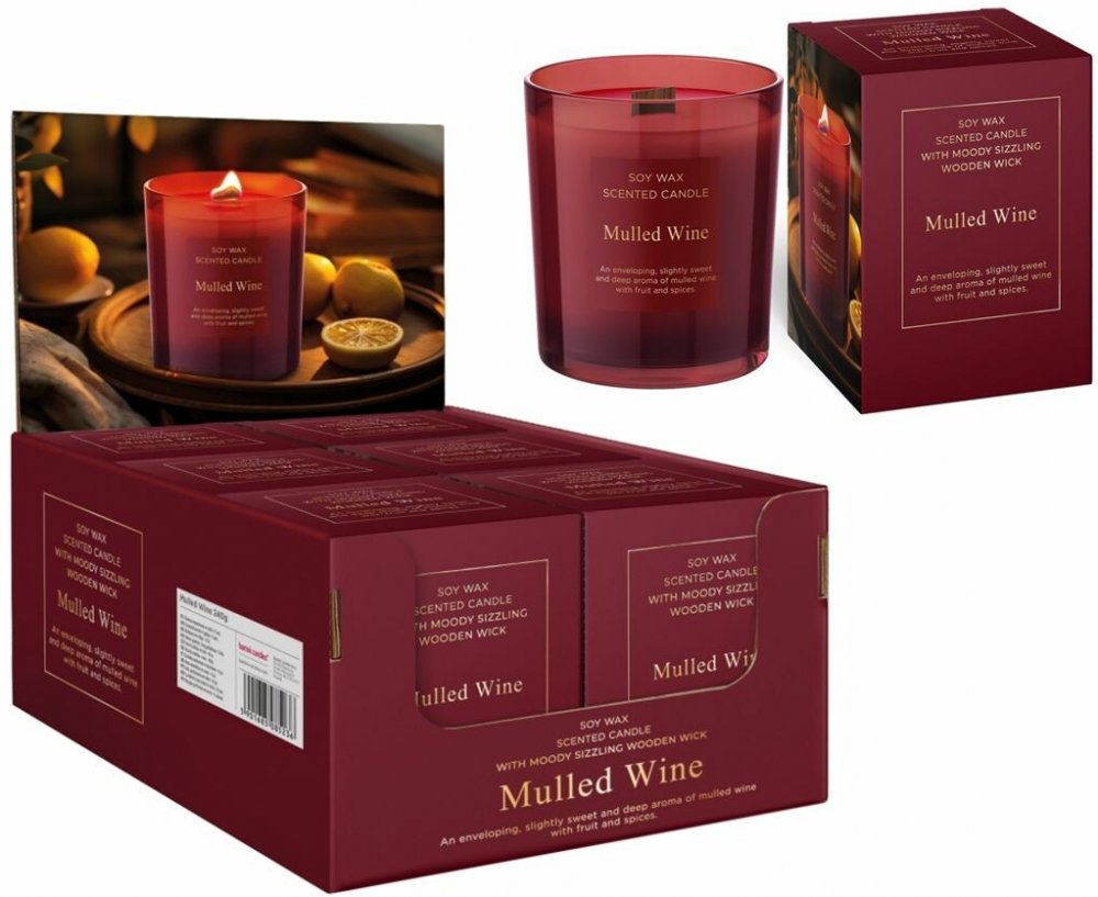 (BAL:6ks) Svíčka s vůní v kónickém skle, dekor svařené víno. Provedení: se sójovým voskem a dřevěným knotem. Vůně: Obklopující, lehce sladká a hluboká vůně svařeného vína. Baleno v luxusní dárkové krabičce. Dekor: decentní, luxusní.Rozměr: 8,5 x 10cm. Rozměr boxu: 19 x 27,5 x 13cm.Doba hoření: 45 hodin. Prodej po 6ks v boxu. Cena za jeden kus.
