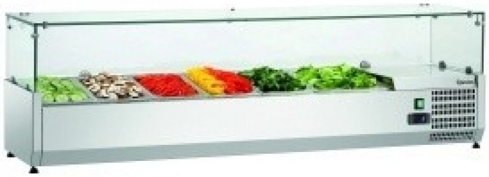 Z nerezové potravinářské oceli se skleněným nástavcem pro 5x1/3 GN + 1/2 GN, o hloubce 100 mm. Elektronické ovládání, odpařování zkondenzované vody, digitální teploměr. Statické chlazení. Provozní teplota: 0 °C až 10 °C. Příkon: 0,174 kW/230 V. Rozměry: 1500 (Š) x 400 (H) x 425 (V) mm. Příslušenství zahrnuje: 4 příčky: 180 x 25 x 13 mm, 5 příček: 326 x 25 x 13 mm. GN objednávejte samostatně. Hmotn...