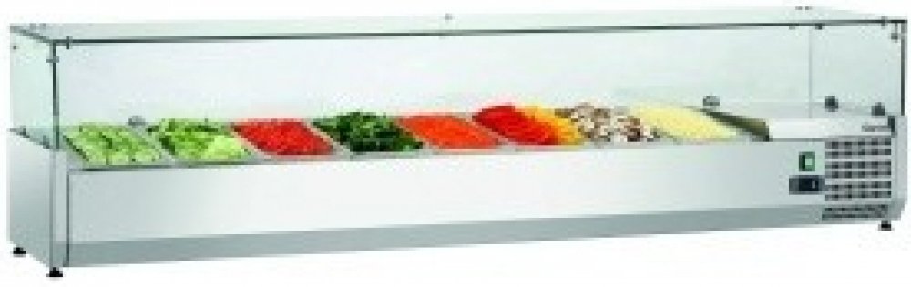 Z nerezové potravinářské oceli se skleněným nástavcem pro 8x1/3 GN, o hloubce 100 mm. Elektronické ovládání, odpařování zkondenzované vody, digitální teploměr. Statické chlazení. Provozní teplota: 0 °C až 10 °C. Příkon: 0,18 kW/230 V. Rozměry: 1800 (Š) x 400 (H) x 425 (V) mm. Příslušenství zahrnuje: 4 příčky: 180 x 25 x 13 mm, 8 příček: 326 x 25 x 13 mm. GN objednávejte samostatně. Hmotnost: 51,9 ...