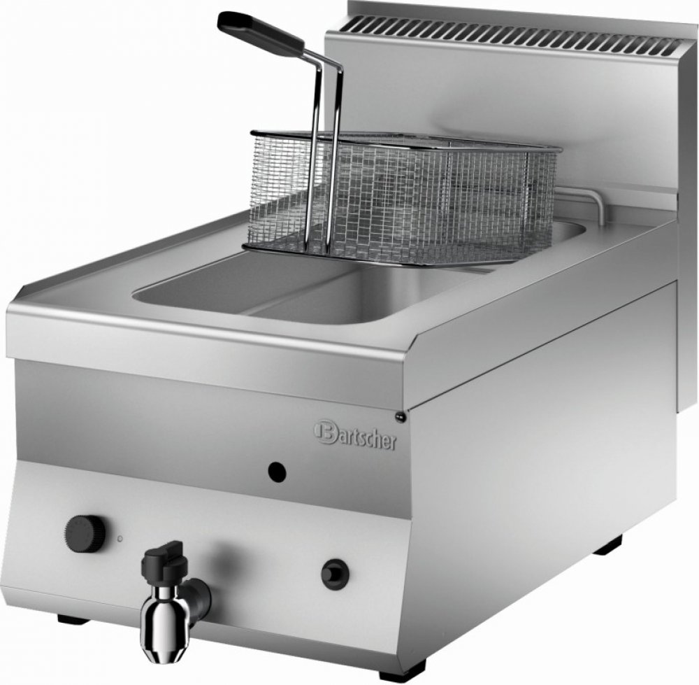 *Plynová fritéza 650, Bartscher 1152103* o rozměrech 400x650x295 mm, vyrobena z chromniklové oceli 18/10. Díky své konstrukci modulového charakteru lze zařízení snadno, libovolně a mnohotvárně spojovat, ukládat a kombinovat v rámci celého kuchyňského bloku restaurace či bufetu. Fritéza je vybavena 1 zaoblenou komorou o objemu 8 l, výpustným kohoutkem, výkon 7 kW/400 V. Balení obsahuje také fritovací koš a trysky pro zemní plyn. Typ plynu: kapalný plyn.