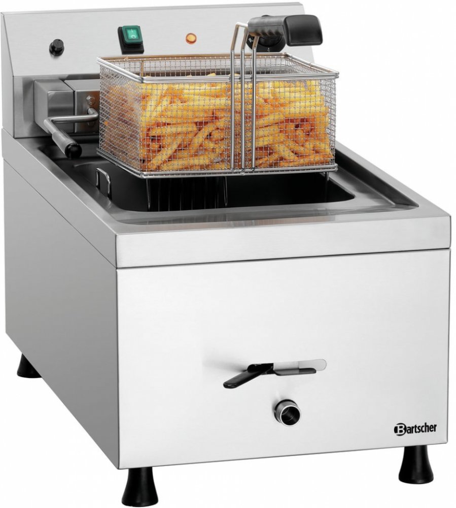 Elektrická fritéza – 1×12 L | Bartscher 162650 je robustní stolní spotřebič s 12litrovou nádobou a je ideální pro použití ve velkých profesionálních kuchyních. Kohoutek na vypouštění tuku, vyjímatelné panádové síto a výkyvné topné těleso umožňují snadné čištění.