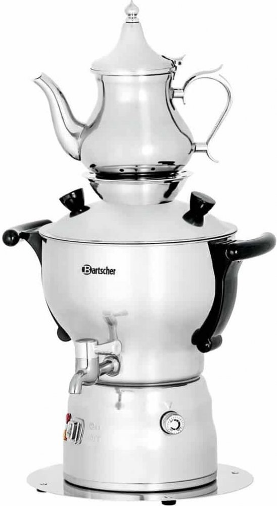 Domácnost Samovar objemu 3 litry, výška sklenice/hrnku max. 125 mm. Teplotní rozsah 30 °C do 100 °C. Plynulá regulace teploty termostaticky. Funkce udržování teploty. Tepelně izolovaná rukojeť. Automatické vypnutí. Ochrana proti přehřátí. 2 topné spirály, 1,5 kW a 0,5 kW. Zahřátí při 100 °C s topnou spirálou 1,5 kW, udržování teploty na 90 °C pomocí 0,5 kW topné spirály. Materiál nerezová ocel, pa...