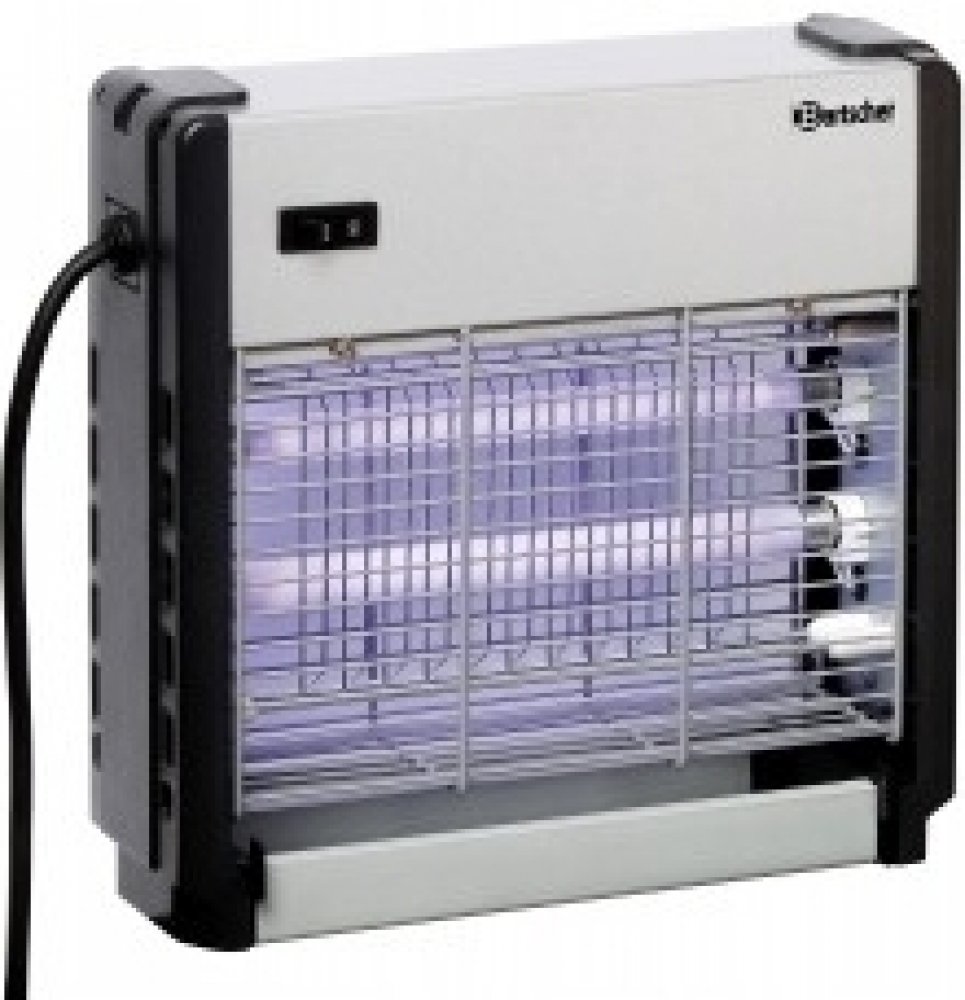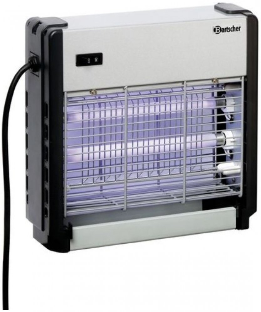 *Lampa proti hmyzu, Bartscher 300306* o rozměrech 265x95x265 mm. Velikost plochy účinnosti: 6-8 m, napětí sítky: 2000-2200 V, světelný výkon 2x6 W, zářivka UV-A. Lampu lze použít jako volně stojící nebo nástěnné zařízení díky řetězu, který je součástí sady.