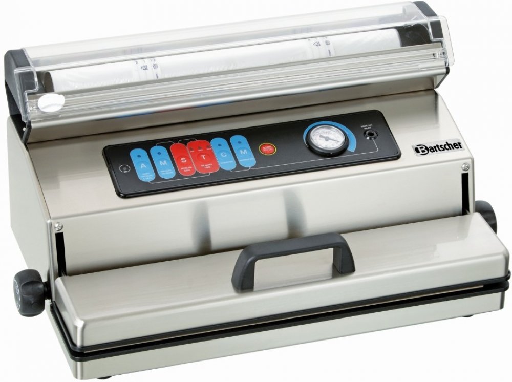 *Vakuová balička, Bartscher 300435* z oceli, o rozměrech 550x325x270 mm. Zařízení vybavené elektronickým ovládáním vakua, svařovací tyčí o délce 400 mm, třístupňovým regulátorem doby svařování, nástavcem na kapaliny, držákem role s integrovaným nožem a kombinovanou funkcí vakuového balení a těsného uzavírání. V sadě se nachází: role fólií pro vakuové balení o rozměrech 400x30 mm, hadicová spojka pro vakuové balení při užití nádob a 5 tašek pro vakuové balení o rozměrech 400x500 mm. Vakuové baličky se budou hodit v gastronomických prodejnách, obchodech a zejména v restauracích k ochraně potravin před škodlivými účinky vzduchu nebo k přípravě jídel metodou sous-vide. Pro vakuové balení by se měly používat pouze speciální vakuové sáčky (jednostranně vlnité, ražené).