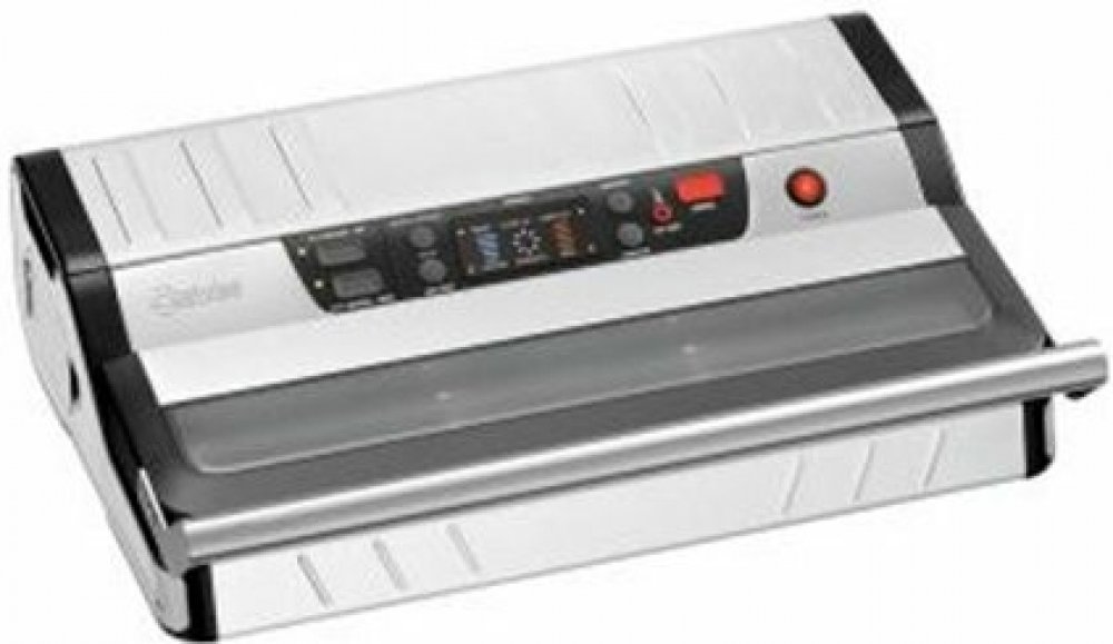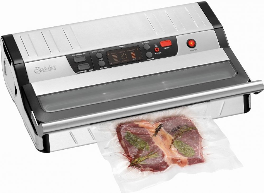 *Vakuová balička, Bartscher 300746* z oceli, o rozměrech 500x395x140 mm. Zařízení vybavené elektronickým ovládáním vakua, držákem role s integrovaným nožem, těsnící lištou, marinovací funkcí a kombinovanými funkcemi vakuového balení a těsnění. V sadě se nachází role fólií pro vakuové balení o rozměrech 400x60 mm. Vakuové baličky se budou hodit v gastronomických prodejnách, obchodech a zejména v restauracích k ochraně potravin před škodlivými účinky vzduchu nebo k přípravě jídel metodou sous-vide. Pro vakuové balení by se měly používat pouze speciální vakuové sáčky (jednostranně vlnité, ražené).
