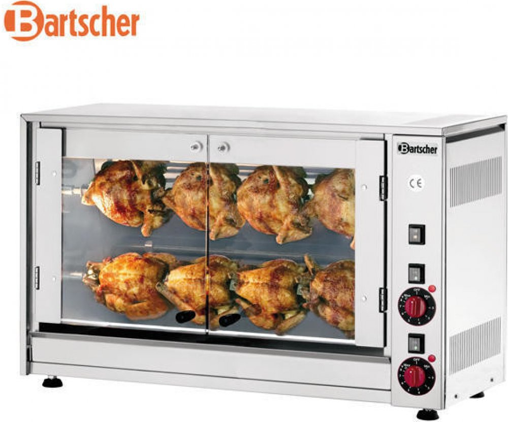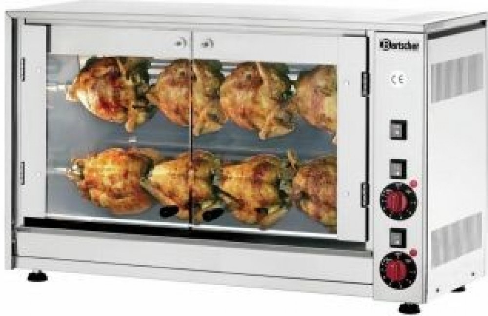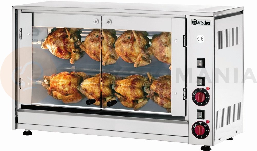 *Elektrický gril na kuřata, Bartscher 215036* o rozměrech 880x430x530 mm Plášť má vyroben z nejkvalitnější nerezové oceli, s vysokou odolností proti poškrábání, prohloubení nebo jinému mechanickému poškození, ale také proti vysokým teplotám. Dveře jsou vyrobeny z tvrzeného skla a mají křídlové otevírání a 2 rotující rožně. Gril je vhodný pro malé restaurace, bary a bufety.
