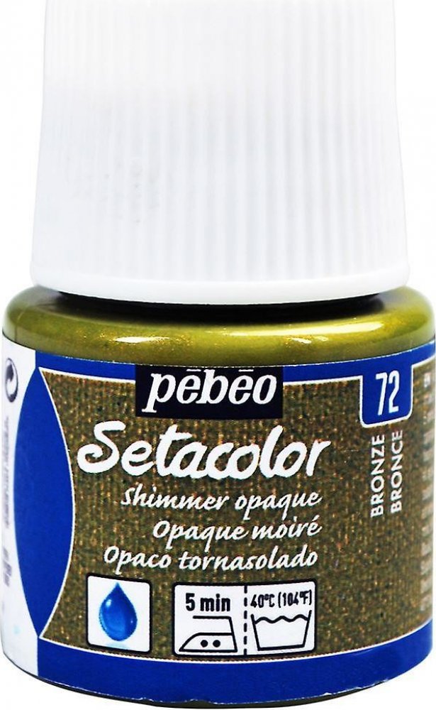 Barva na textil Setacolor 45 ml – 72 bronzová perleťová Krycí barvy na textil Setacolor značky Pébéo ve škále 24 různých barev po 45ml a dalších 23 metalických odstínů. Dají se mezi sebou míchat, nanášejte štět cem či houbičkou nebo například pomocí šablon. Aplikujte na vypraný a vyžehlený textil a po cca 1 hodině zasychání fixujte zažehlením z rubové strany po době cca 5 minut. Po fixaci lze prát...