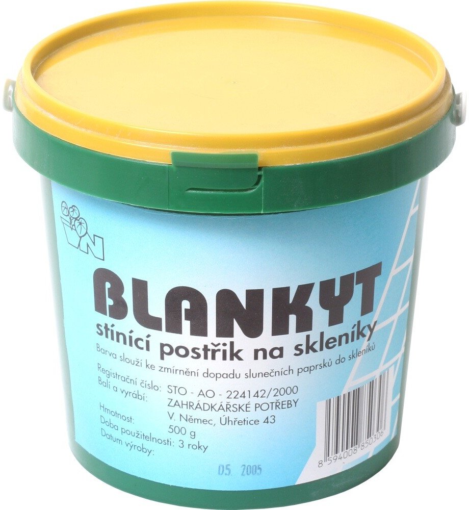 Barva stínicí Blankyt 500g je přípravek určený pro ochranu rostlin před přímým slunečním zářením a nadměrným teplem . Tato stínicí barva se používá k aplikaci na skleníky, pařeniště a fóliovníky