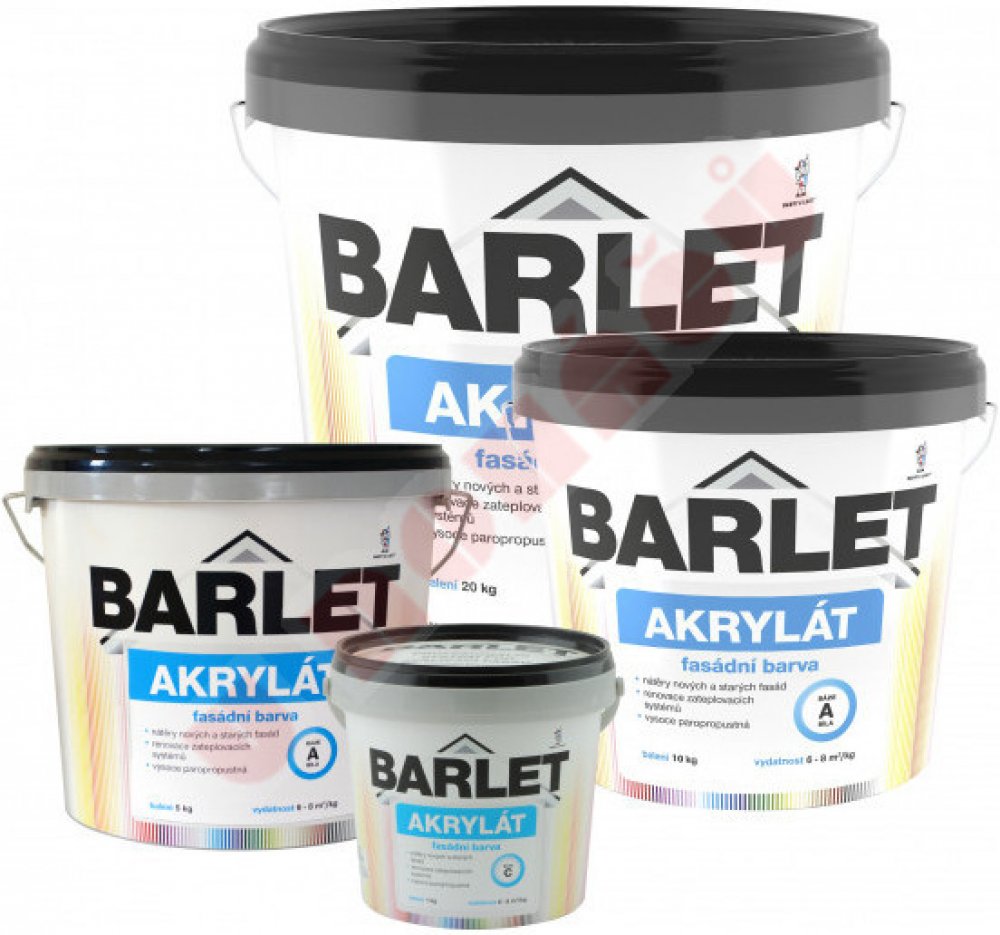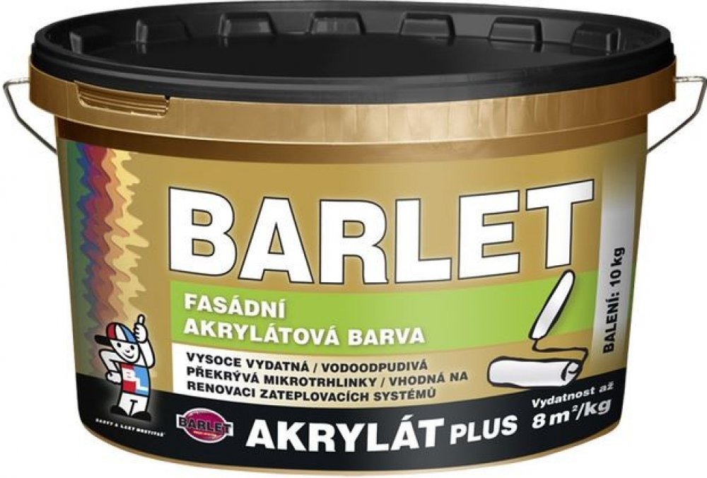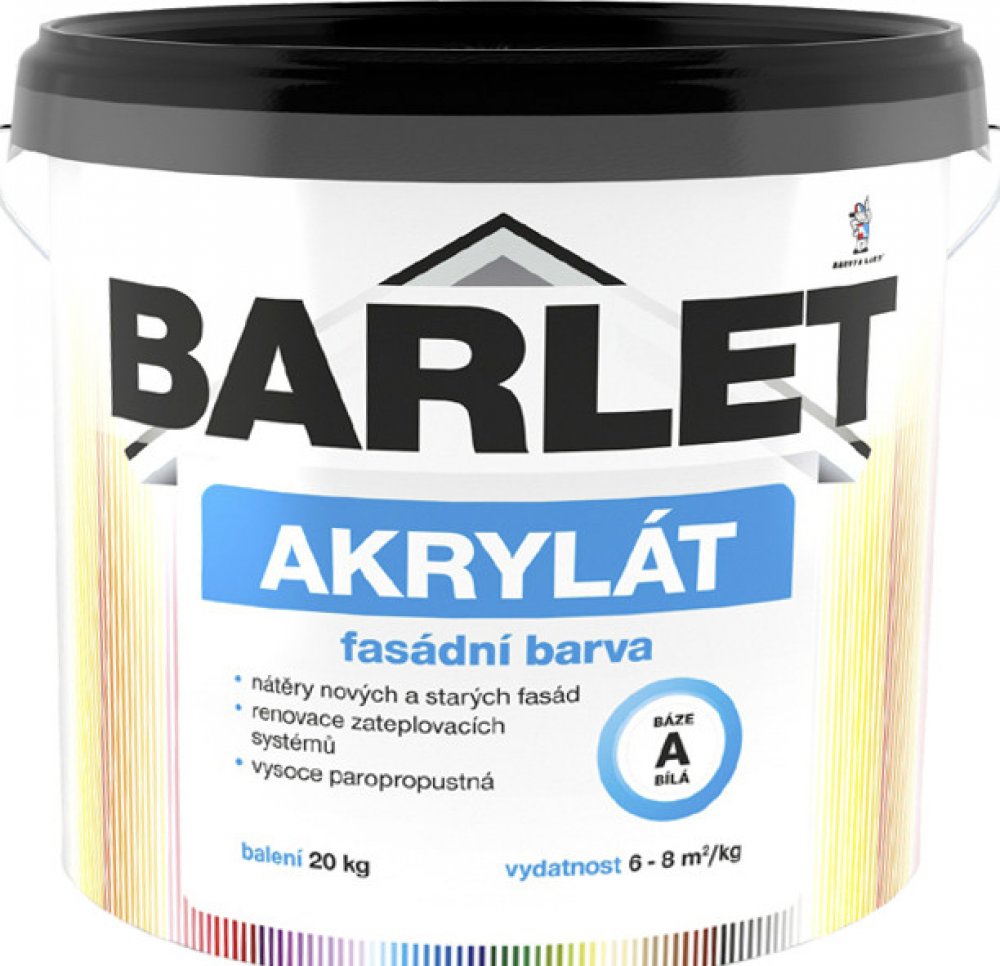 Barlet Akrylát plus V4013 Akrylátová barva pro nátěry vápenocementových omítek, betonů, pórobetonů, dřevotřísky apod. Vhodná i na sanační omítky a pro renovaci zateplovacích systémů.Barlet Akrylát plus V4013 lze použít i k nátěrům interiérů ve zdravotnických zařízeních. Je odolná působení nejčastěji používaných látek pro dezinfekci povrchů. Pro informaci zkušební protokol ke stažení. Pracovní postup: Nová vápenocementová omítka se natírá štětkou prostředkem Barlet penetrační nátěr univerzální V 1307 nebo hloubkový V 1308, zasychání min. 4 hodiny. potom 2x nátěr barvou Barlet Plus akrylát v časovém intervalu mezi nátěry 4–6 hod. První nátěr doporučujeme provést štětkou. Vydatnost: 8 m2/1 kg v jedné vrstvě Způsob aplikace: štětka, váleček Ředidlo: voda