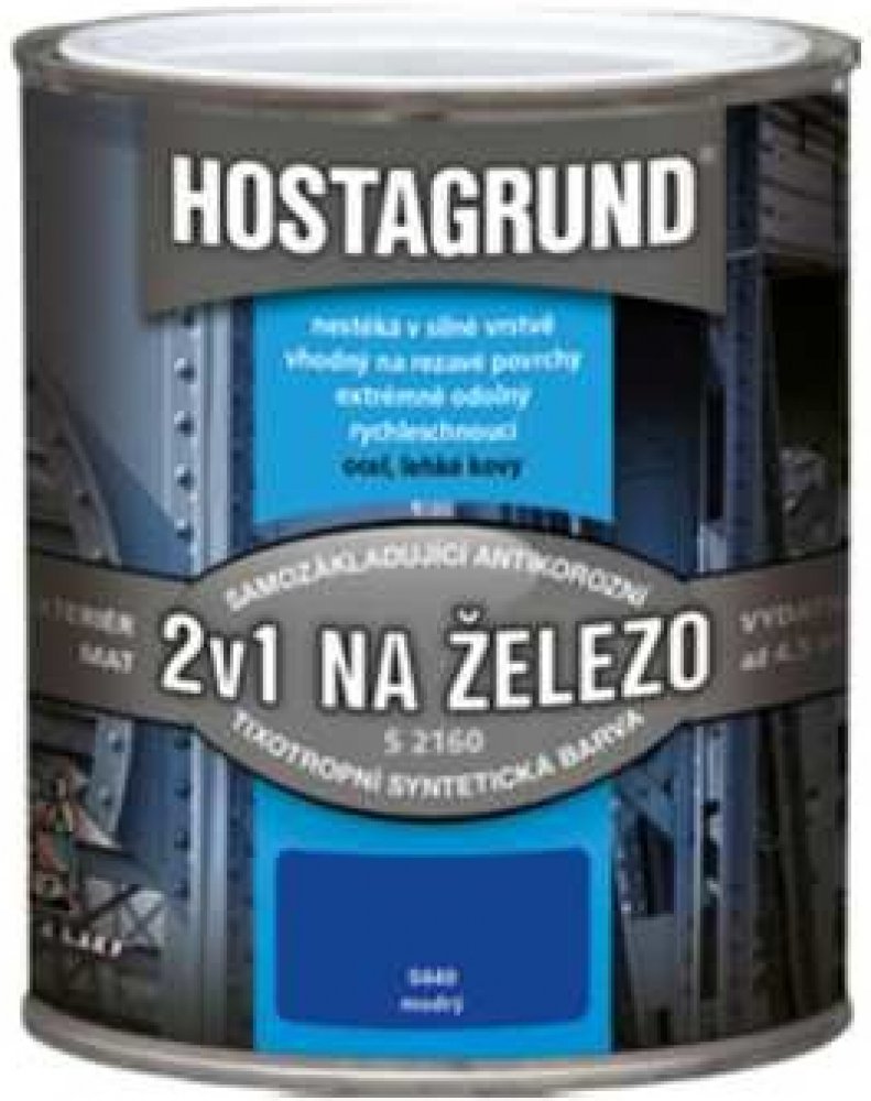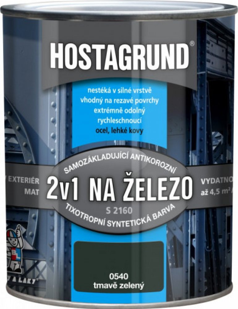 HOSTAGRUND 2v1 NA ŽELEZO S2160 je základní i vrchní syntetický nátěr na železo. Určen pro zhotovení jednovrstvých venkovních nátěrů ocelových konstrukcí, např. stožárů, mostů, podvozků, plotů, vystavených přímým povětrnostním vlivům. Barvu lze použít i pro ochranné nátěry nekovových podkladů, např. beton, dřevo. Barva má tixotropní charakter, který spolu se speciálním složením umožňuje dosažení silné vrstvy a ochranných vlastností jedním nátěrem. Nanáší se přímo na podklad, zbavený mechanických nečistot a rzi.
