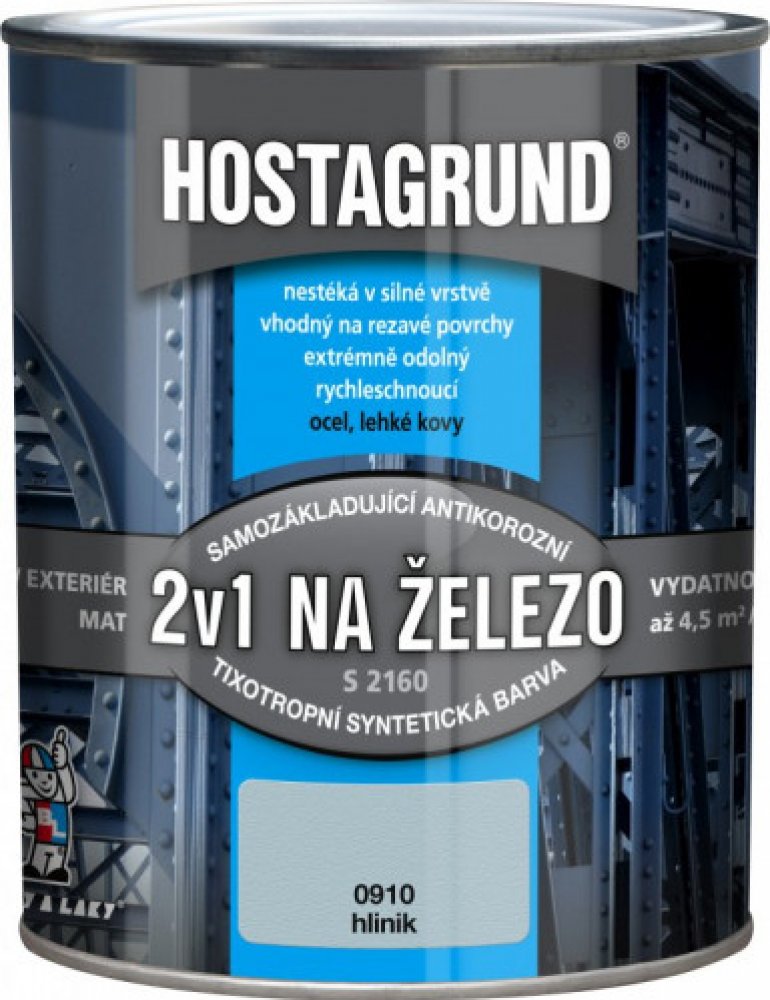 Hostagrund 2v1 S2160 základní i vrchní barva na kov, 0910 hliníková, 600 ml Základní i vrchní syntetický nátěr na železo. Určen pro zhotovení jednovrstvých venkovních nátěrů ocelových konstrukcí, např. stožárů, mostů, podvozků, plotů, vystavených přímým povětrnostním vlivům.