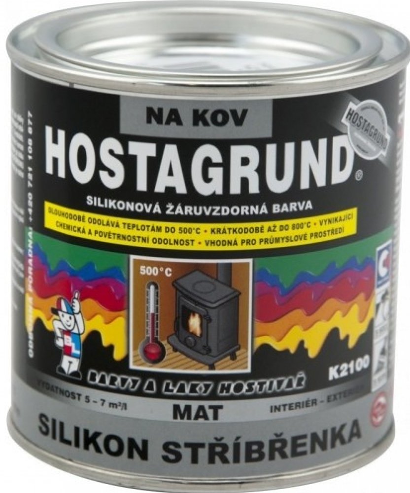 HOSTAGRUND® SILIKON STRÍBRENKA je vhodný k ochrane napr. výmeníku tepla, kouřovodu, dvířek pecí, automobilivých výfuku z nerezivející oceli, ocelového potrubí na horkou páru, odtahy sušáren apod. Barva se nanáší na suchý, odmaštený povrch štetcem nebo stríkáním v jedné až dvou vrstvách, v závisloti na agresivite okolního prostredí. Pro lepší ochranu kovu proti vlivum koroze je vhodné barvu nanášet...