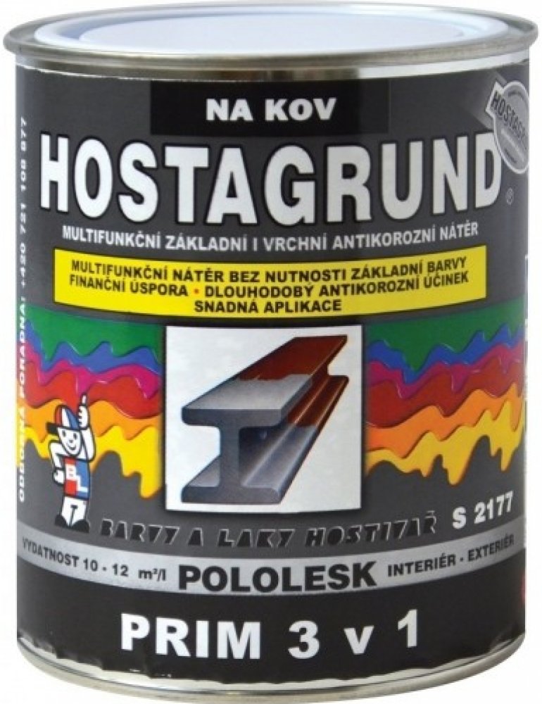 HOSTAGRUND 3v1 PRIM je jednovrstvá polomatná barva spojující vlastnosti základního antikorozního nátěru, mezivrstvy a vrchní barvy. Určena k přímým nátěrům kovů v exteriéru i interiéru. Barva je ideální pro nátěry rozmanitých kovů, včetně čerstvého pozinku, zejména pro nátěry střech, kovových konstrukcí, stožárů, plotů, sloupů, vrat apod. Barvu je po předchozí penetraci podkladu možné použít i jako nátěr dřeva nebo betonu. Vlastnosti: - Multifunkční základní i vrchní antikorozní nátěr - Dlouhodobá odolnost povětrnostním vlivům - Bariérová antikorozní ochrana - Obsahuje teflon - Perfektní odolnost, výjimečná přilnavost a pružnost - Rychlé schnutí - Pro bezpečné ošetření kovů stačí již dva nátěry - Nanášet můžete prostřednictvím štětce, válečku a stříkání - Vydatnost 10-12 m2/1l na jednu vrstvu Upozorňujeme, že odstíny barev vyobrazené na barevné paletě se mohou mírně lišit od skutečnosti. Podrobnější informace naleznete v technickém listu k dispozici ke stažení v sekci ""Datové listy"".