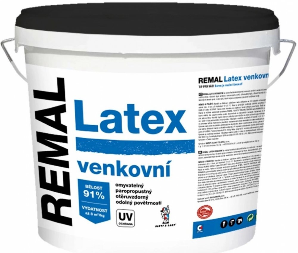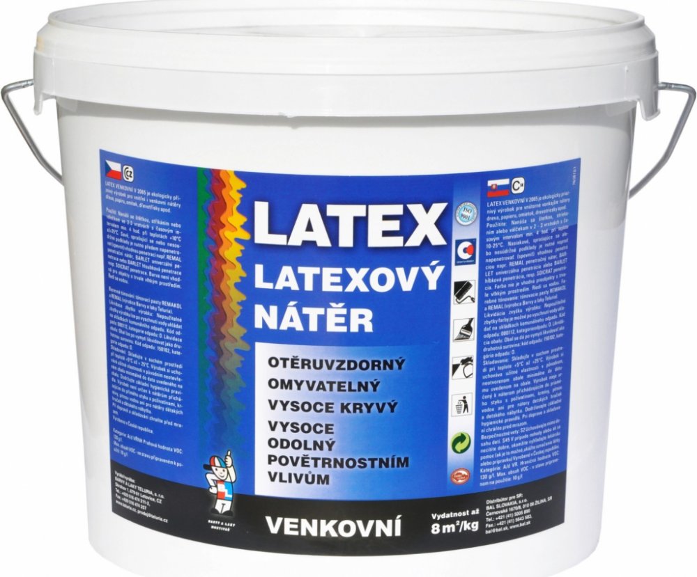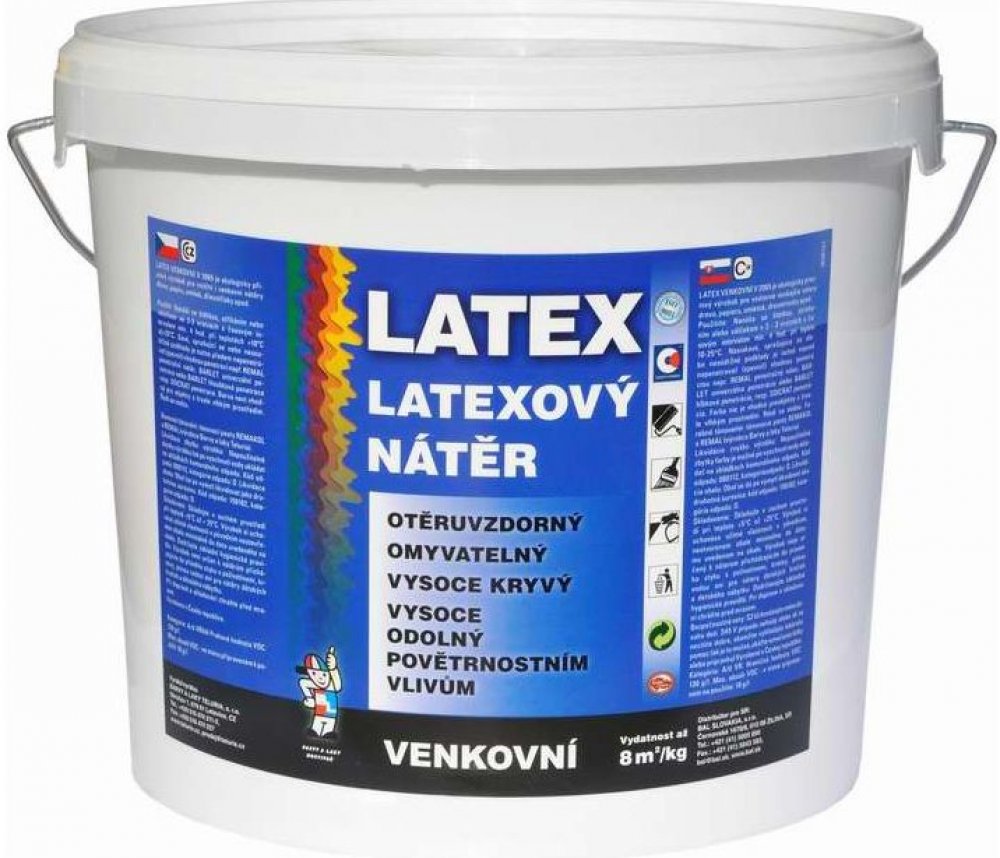 REMAL Latex venkovní V2065 je latexový nátěr určený pro vnitřní a venkovní nátěry stavebních materiálů jako jsou zdivo, dřevo, dřevotřískové a dřevovláknité desky a papír. Je omyvatelný, s vysokou bělostí a dobře kryje. Není vhodný pro objekty s trvale vlhkým prostředím. Používá se pro venkovní nátěry stavebních materiálů, jako jsou zdivo, dřevo, dřevotřískové a dřevovláknité desky a papír. Teplota prostředí a podkladu při nátěrech ზ °C až ქ °C. Barva není vhodná pro objekty s trvale vlhkým prostředím. Barva vykazuje odolnost proti oděru za mokra - měřeno dle ČSN EN ISO 11998 - třída 3. (klasifikace dle EN 13300). Podrobnější informace naleznete v technickém listu k dispozici ke stažení v sekci ""Datové listy"".