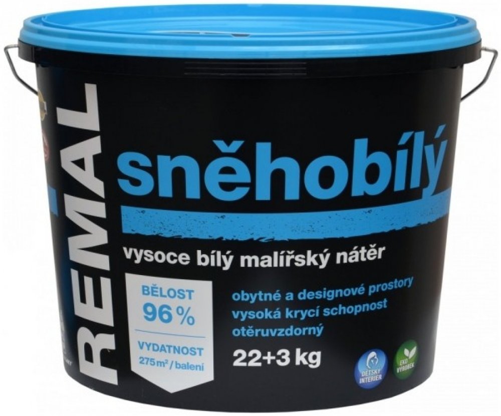 Je doporučen pro nátěry obytných a designových prostor. Používá se k malování stěn i stropů v interiéru na omítky, sádrokartony a jiné podklady. Je snadno zpracovatelný, zdravotně nezávadný a ekologicky příznivý. REMAL SNĚHOBÍLÝ je vodouředitelná malířská barva s vysokou bělostí. Výborně kryje, je prodyšná, otěruvzdorná a má vysokou bělost 96 %. Používá se k malování omítek, betonu, sádrokartonu, cetris desek, dřevotřísky i sanačních omítek v interiérech. Barva vykazuje odolnost proti oděru za mokra – měřeno dle ČSN EN ISO 11998 – třída 5. (klasifikace dle EN 13300). Vydatnost: 11 m²/1 kg naředěné barvy pro jeden nátěr Tónování:Tónovacími pastami REMAL TEKUTÁ TÓNOVACÍ BARVA nebo REMAKOL. Příprava podkladu:Před malováním odstraňte vrstvy starých a nepřilnavých nátěrů. Savé a sprašující podklady ošetřete penetrací REMAL, SOICRAT nebo BARLET. Povrch tak zbavíte prachu, zpevníte jej, sjednotíte savost a zaručíte přilnavost. Doba schnutí je 4 hod. Nerovnosti na zdi vyrovnejte stěrkou REMAL STĚRKA. Pracovní postup:Nátěr zřeďte v poměru max. 0,4 l vody na 1 kg barvy. Poté důkladně promíchejte. Nanášejte štětkou, válečkem nebo stříkáním ve 2 vrstvách, další vrstvu nanášejte po vyschnutí předešlé, minimálně po 4 hod. Optimální teplota pro natírání je 15 až 25 °C. Barvu si můžete natónovat výrobkem REMAL TEKUTÁ TÓNOVACÍ BARVA nebo REMAKOL. Může se Vám hodit zakrývací materiál, jako lepicí pásky či zakrývací fólie, případně brusné papíry. Nezapomeňte na štětce, válečky, štětky a špachtle.