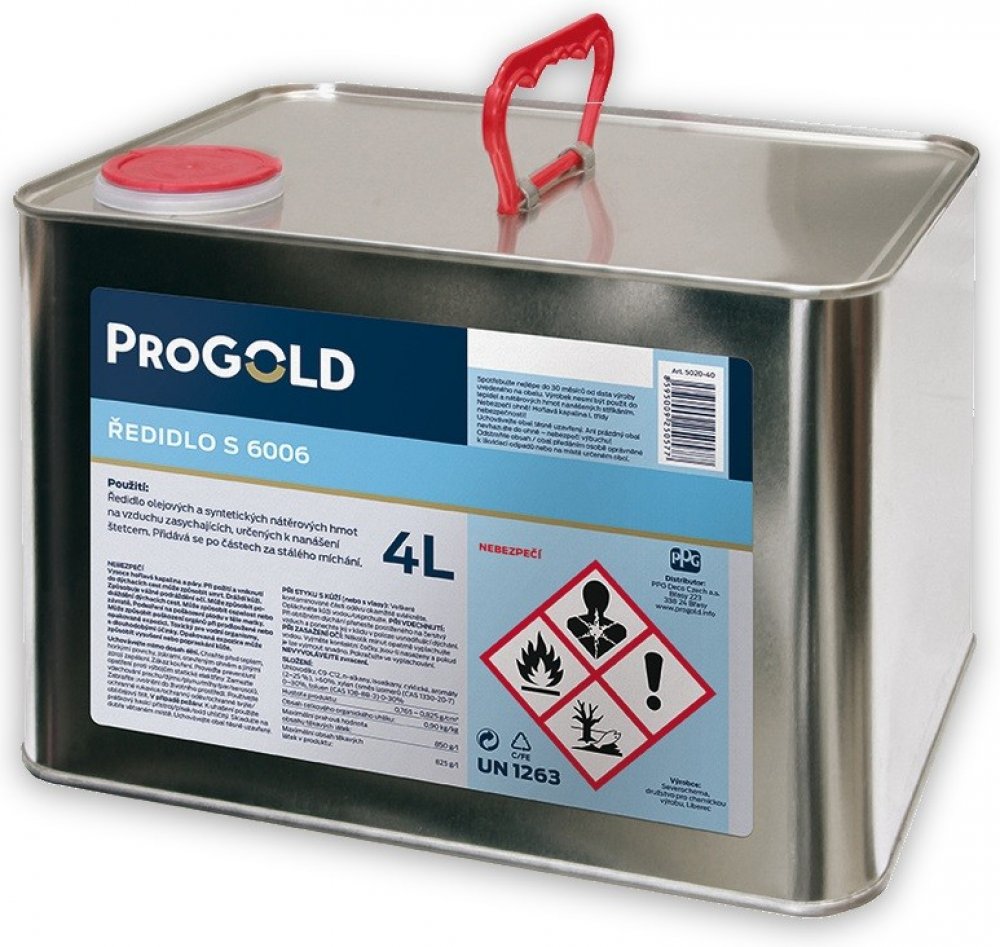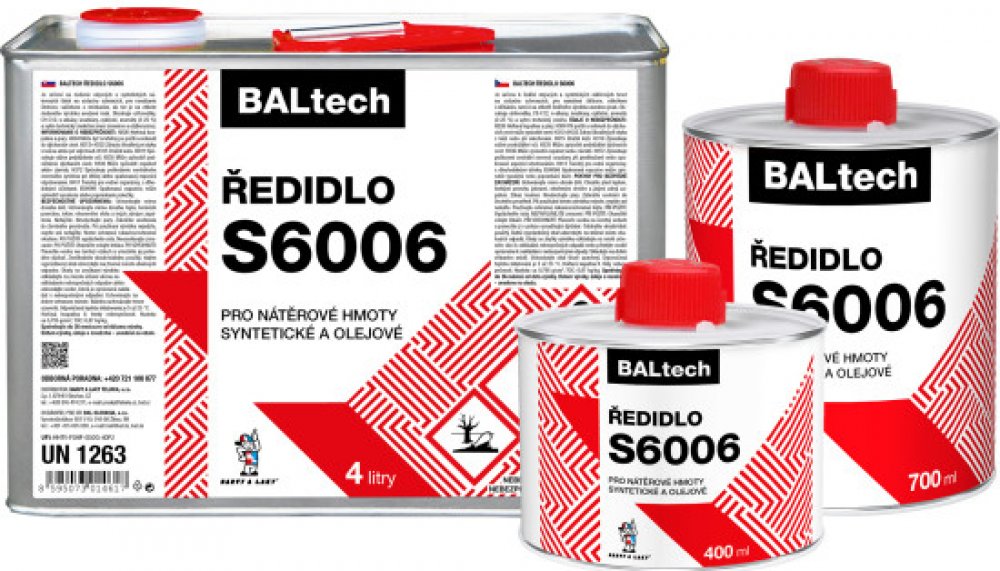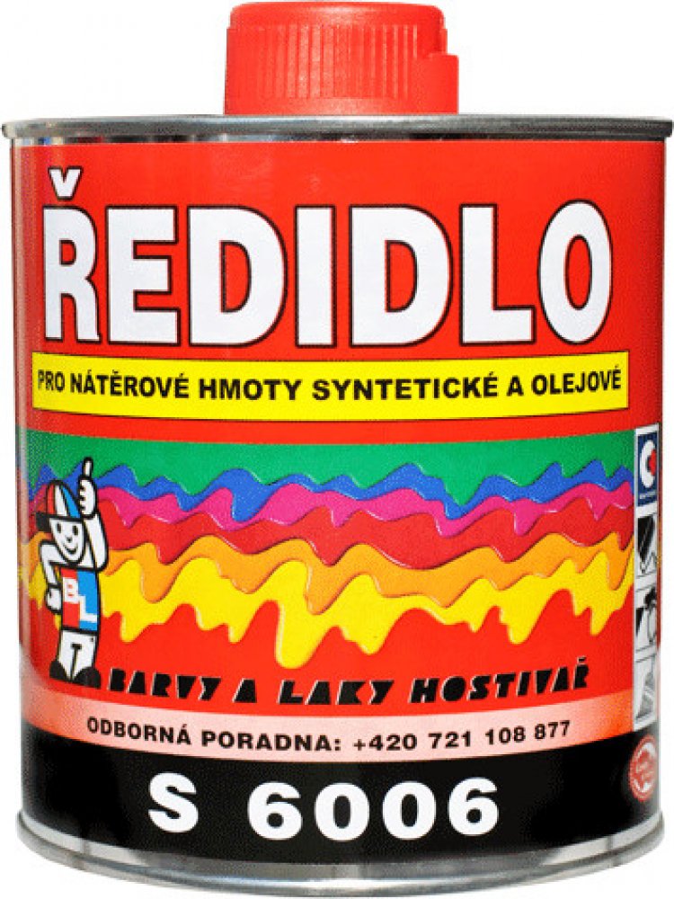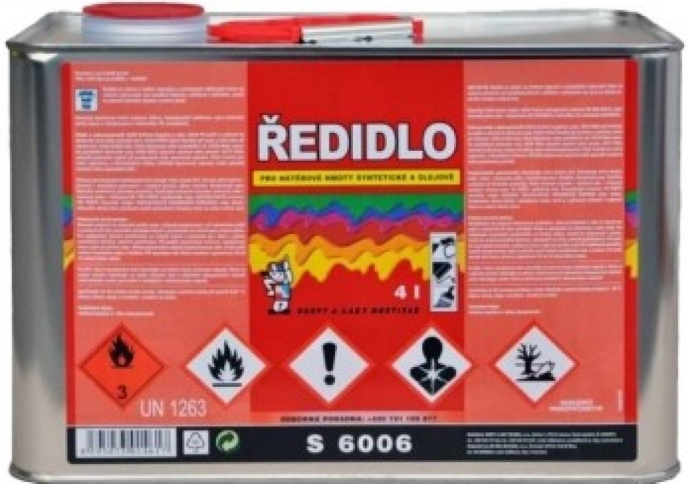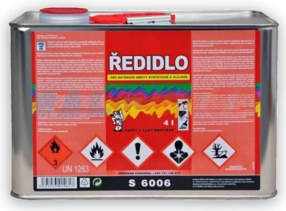 Ředidlo S 6006 Je určeno k ředění syntetických a olejových na vzduchu schnoucích nátěrových hmot. Používá se pro ředění nátěrů připravených k nanášení štětcem, válečkem a máčením, pokud není výrobcem barvy předepsané jiné ředidlo. Ředidlem S6006 je možné i čištit použité nářadí.