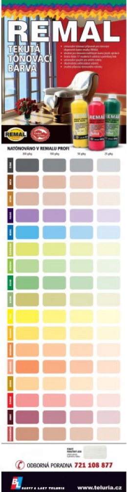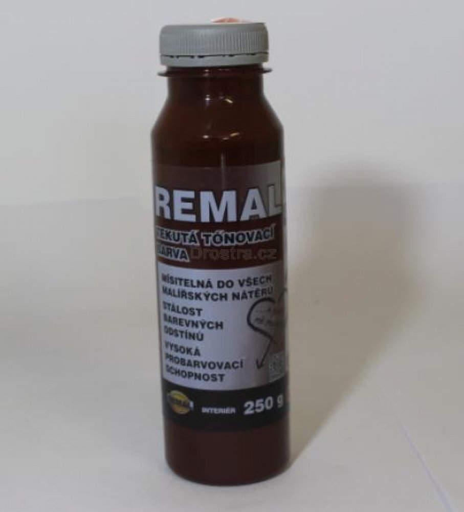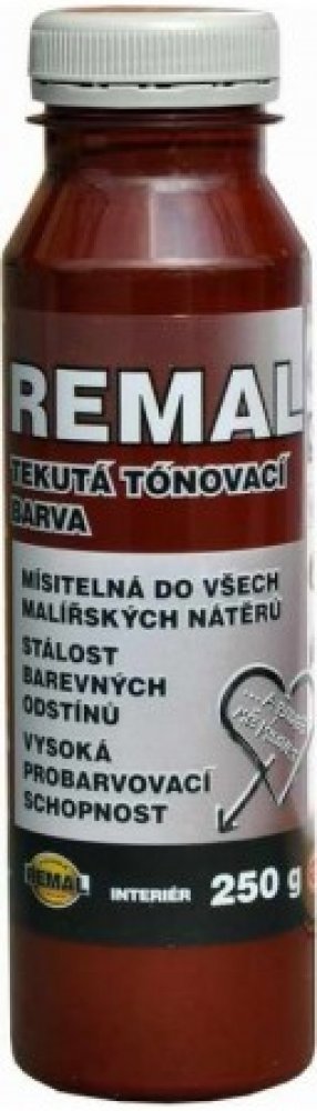 Remal tónovací barva se používá k obarvování malířských barev pro interiéry, vybrané odstíny i k obarvování akrylátových a silikonových fasádních barev pro exteriéry. Pasta se řádně protřepe a dávkování se provádí podle vzorníku na etiketě. Pracovní postup:Remal tónovací barva se přidává do tekuté malířské barvy Remal standard nebo jiných naklížených malířských přípravků až se dosáhne požadovaného barevného odstínu. Dosažení požadovaného odstínu je třeba zkontrolovat zkušebním nátěrem. Zaschlý nátěr je poněkud světlejší než barva roztoku. Použití:K probarvování malířských barev pro interiéry. Odstíny černá, hnědá, béžová, okrová a červenohnědá i k probarvování vodouředitelných barev v exteriérech. Ředění:Vodou ředitelné Příklad nátěrového postupu:Před použitím barvu řádně protřepeme. Dávkování je možné provádět podle vzorníku tak, že potřební množství tónovací barvy rozmícháme v odměřené vodě určené k naředění tónované barvy a vmícháme do barvy. Dosažení požadovaného odstínu zkontrolujeme zkušebním nátěrem. Upozornění z hlediska bezpečnosti a ochrany zdraví:Dodržujte základní hygienická pravidla. Výrobek není určen k nátěrům přicházejícím do přímého styku s poživatinami, krmivy a pitnou vodou ani k nátěrům dětského nábytku a hraček. Skladovatelnost:Výrobek si uchovává užitné vlastnosti 5 let od data výroby, v původním neotevřeném obalu. Skladujte v suchém skladu při teplotě +5 °C až +25 °C. Při dopravě a skladování chraňte před mrazem! Složení a charakteristika výrobku:Směsi anorganických příp. organických pigmentů, aditiv a fungicidních látek dispergované ve vodném roztoku.